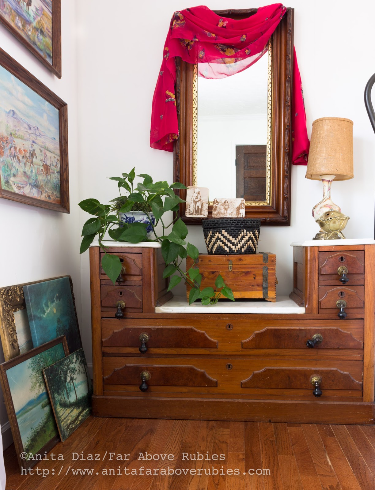 A piece of an Indian sari is draped across the antique mirror for a pop of bold color.