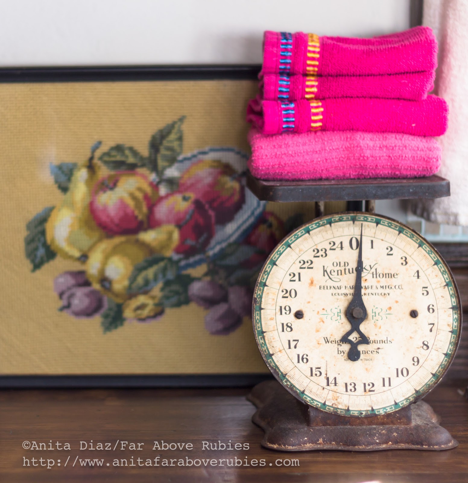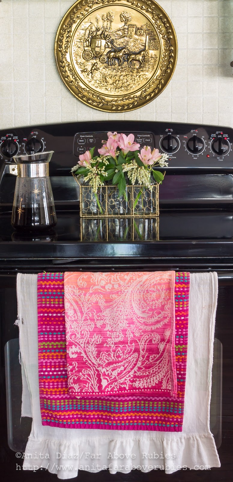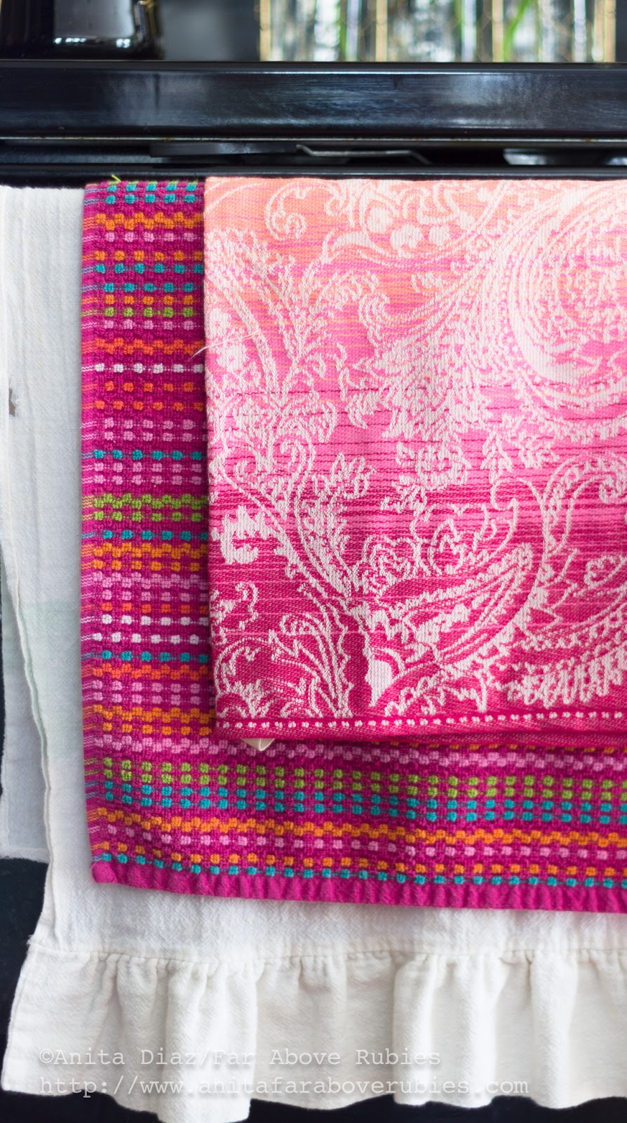 I love my colorful linens, and bought several of these striped towels when they were at Walmart last summer. The paisley towel came from World Market, and I made the feedsack towel.