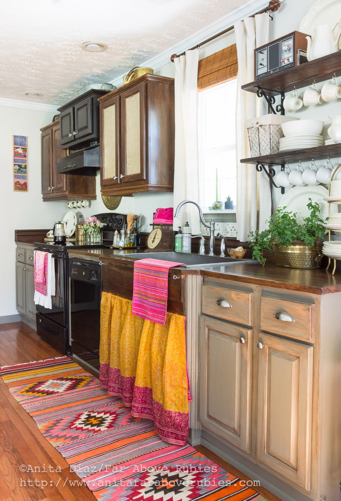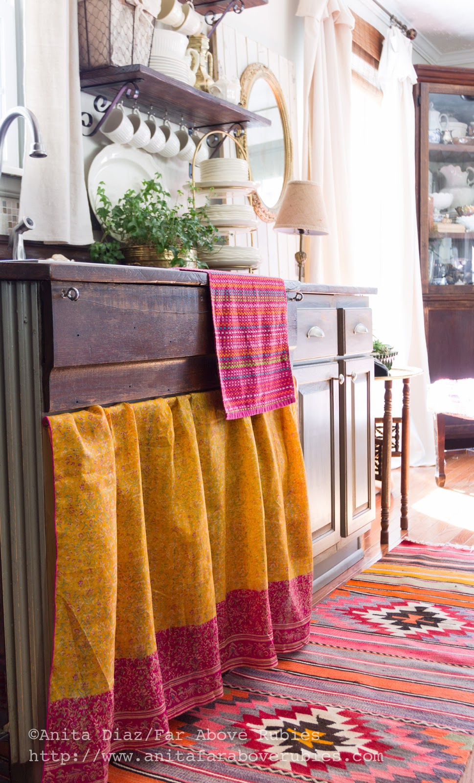 An Indian sari is simply draped over a rod to cover the cabinet opening, and a Turkish kilim runner provides the color inspiration for the room.
