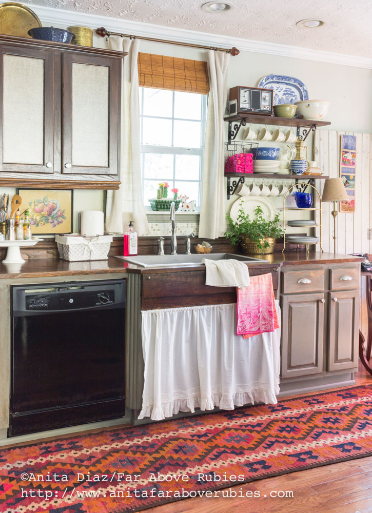 I took the doors off the cabinet below the sink and made a ruffled sink skirt. I had painted over the backsplash, but never liked it as it just blended into the wood. Not sure what I was thinking when I did that.