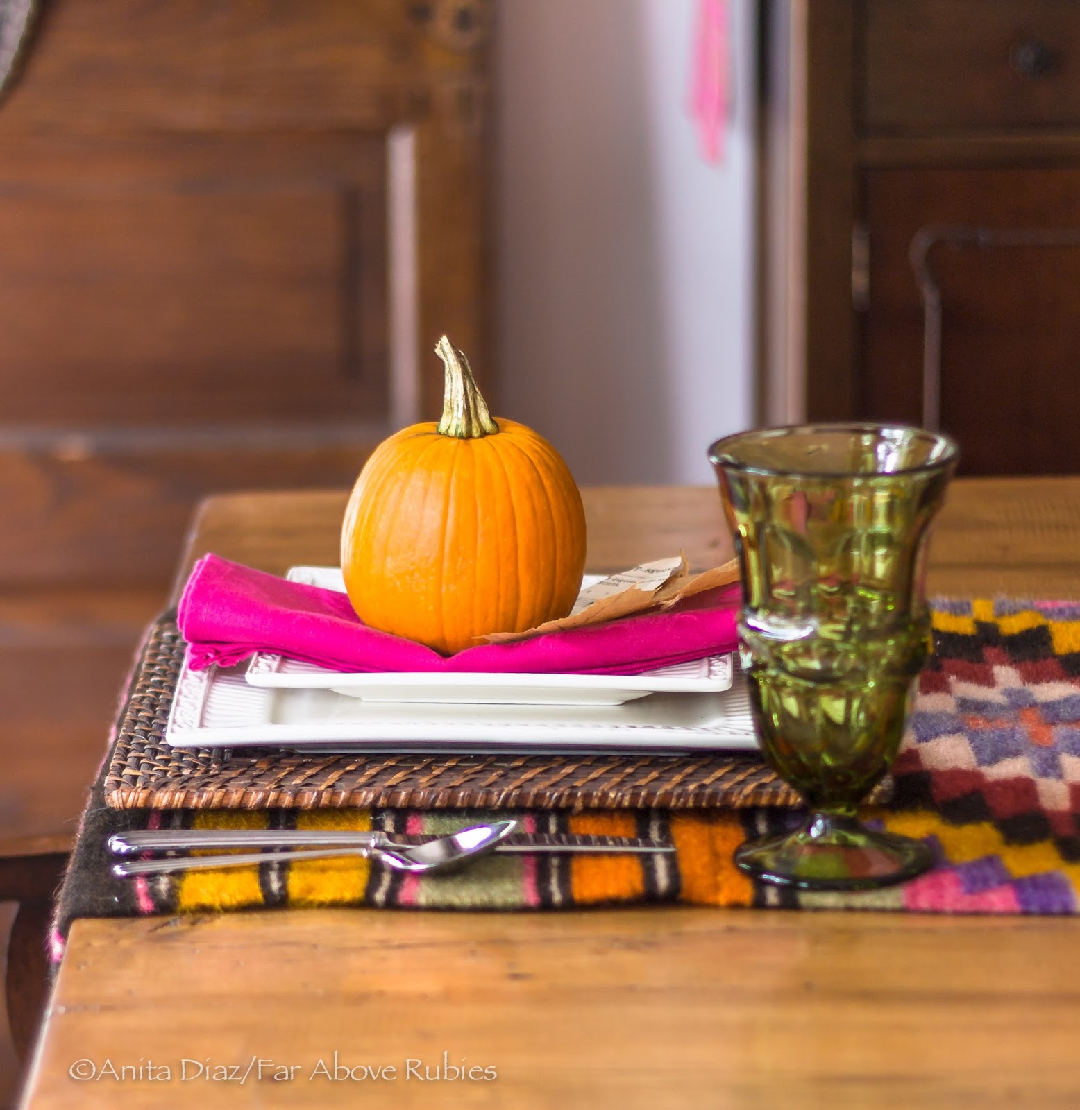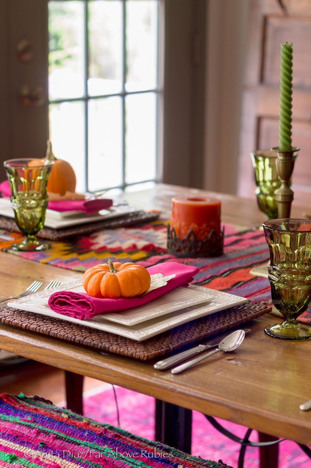 I love the unexpected — like hot pink paired with orange. I think it’s just the perfect color combo for fall and looks stunning on the table — especially when toned down with the green glass.