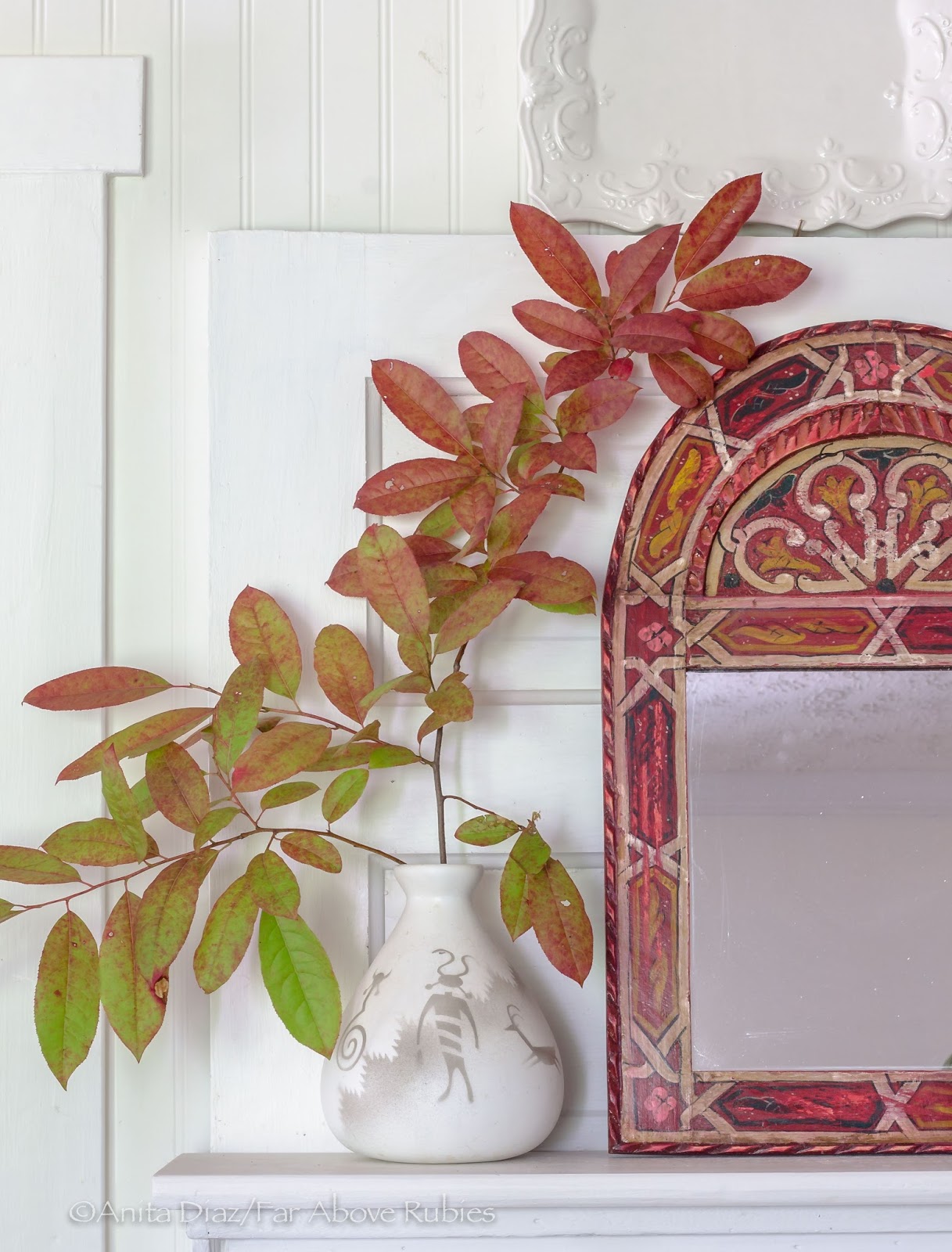 I dressed my DIY mantel with a moroccan mirror, Navajo pottery, inherited candlestick and a lone branch from the woods.
