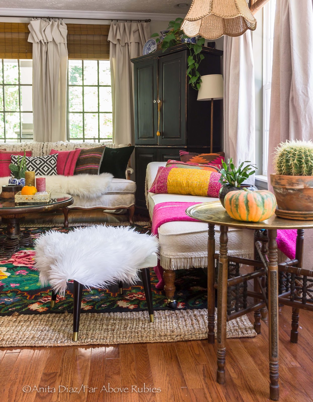 Mostly neutral furniture allows me to accessorize however I want. For autumn, I love layering velvet and kilim pillows along with fur throws, falsa blankets and a moroccan wedding blanket.