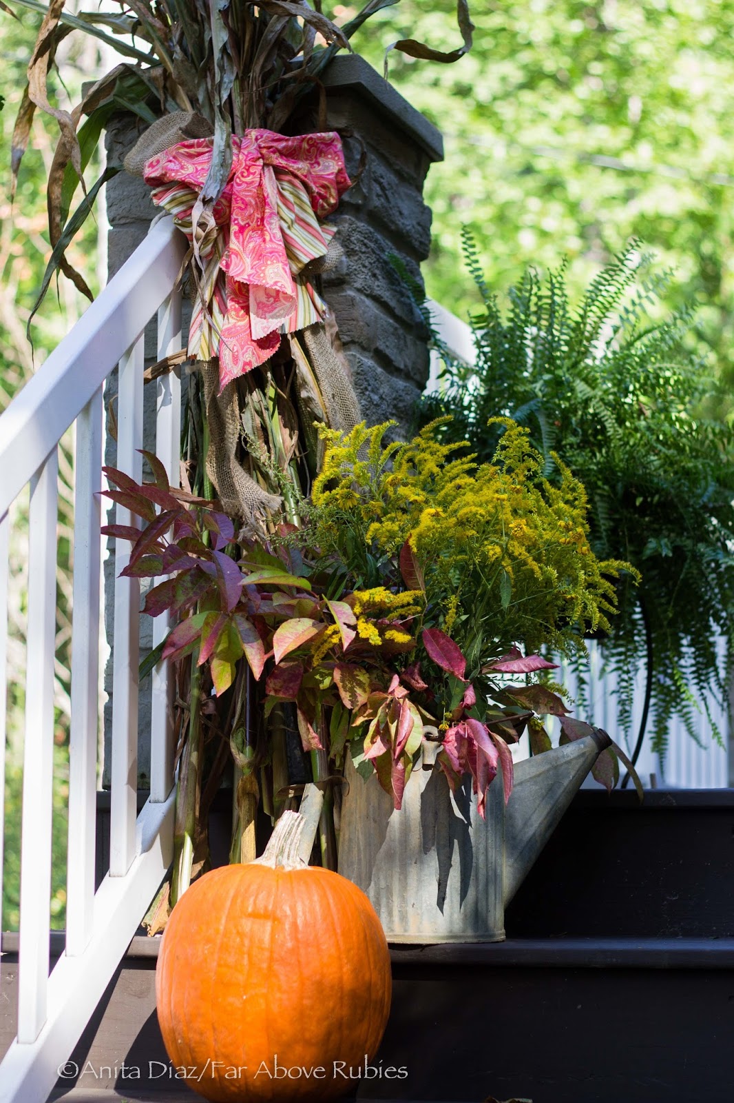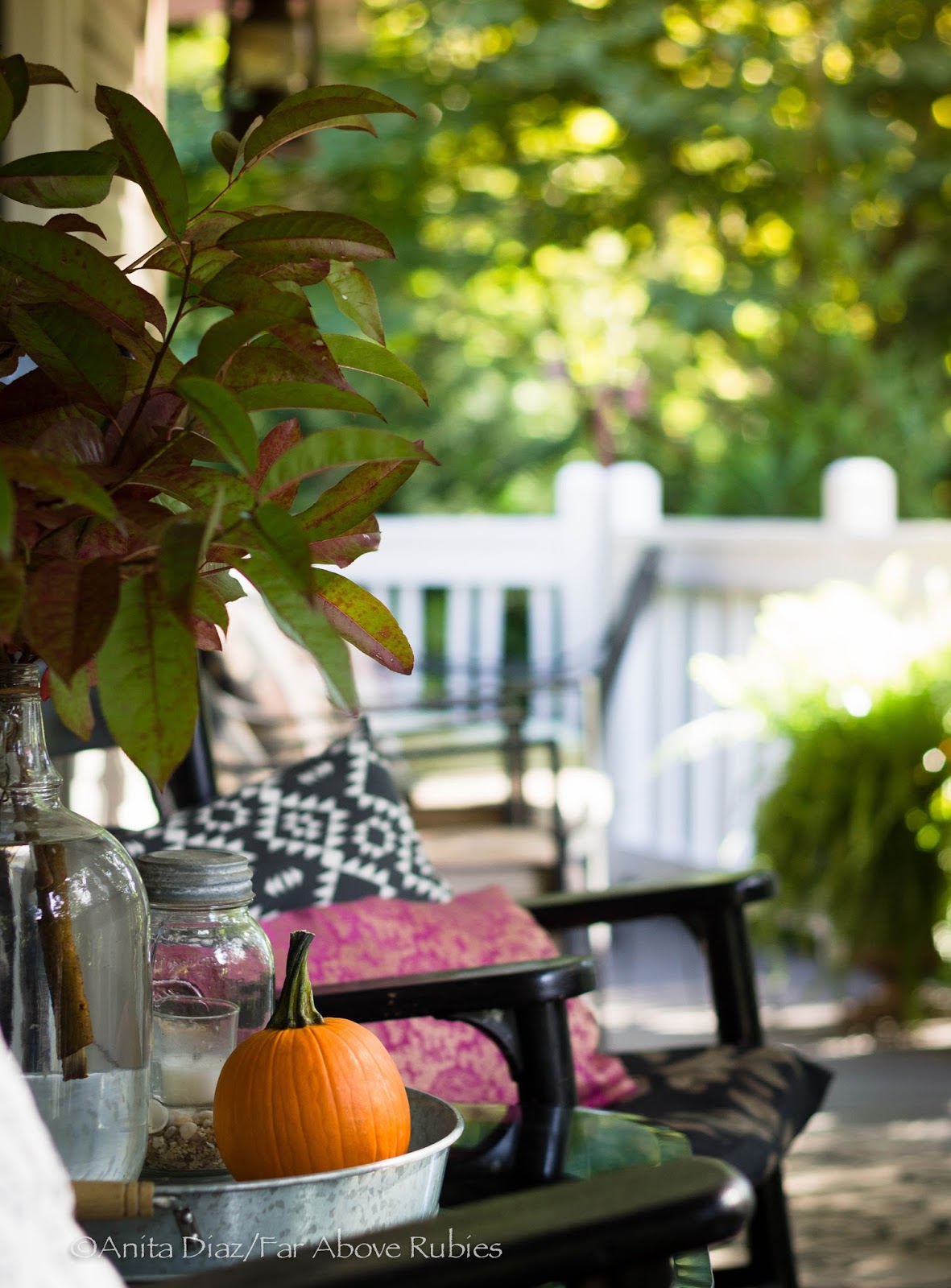 We’re going to start on the porch, then head into the house. First off, you should know that I love color, and I’m not afraid to mix any two colors — or three or four, together. For autumn, I’ve added orange to my hot pinks for a vibrant and bold palette pulled directly from the nature.