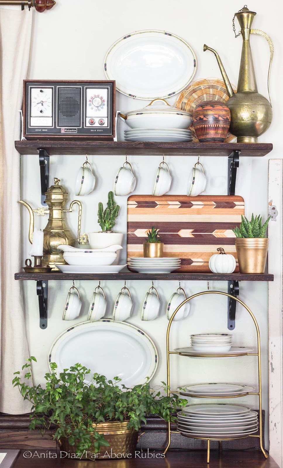 I love the open shelves we added and enjoy accessorizing them for all seasons. I have added some Native art, including a Navajo pot and an amazing Cherokee-crafted cutting board, to the inherited china.