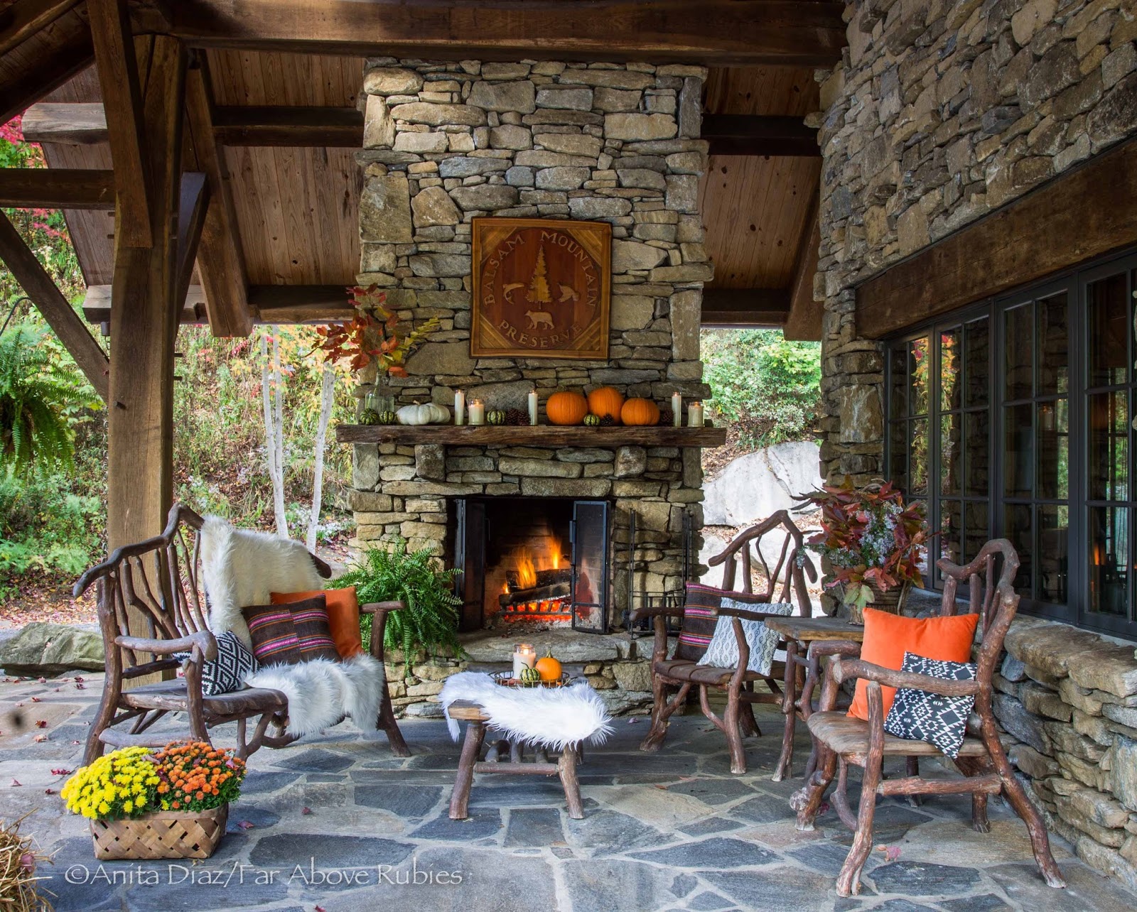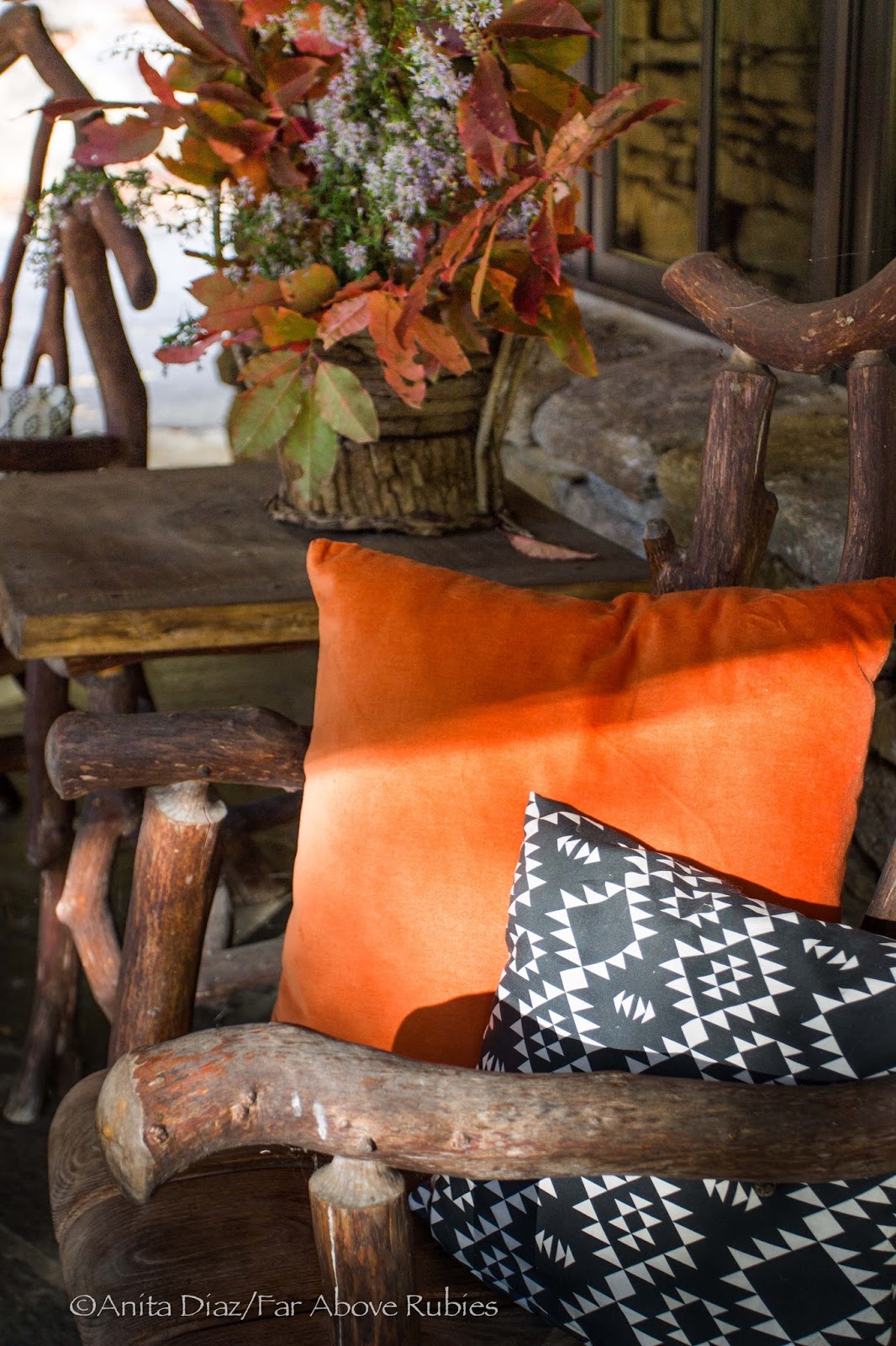 This is so gorgeous! I love the stone fireplace and rustic 'twig' furniture. The oranges really pop against the neutral brown backdrop. The last photo of the sunset is stunning! It all looks so amazing Anita.