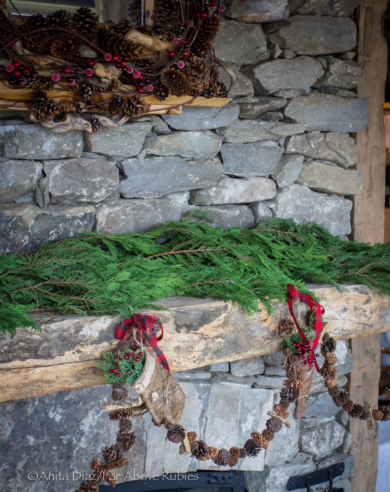 On the back side of the fireplace, I simply used greenery and garland of pine cones they had in the decor stash. I added the little mittens and stockings as well as the tartan bows for some color.