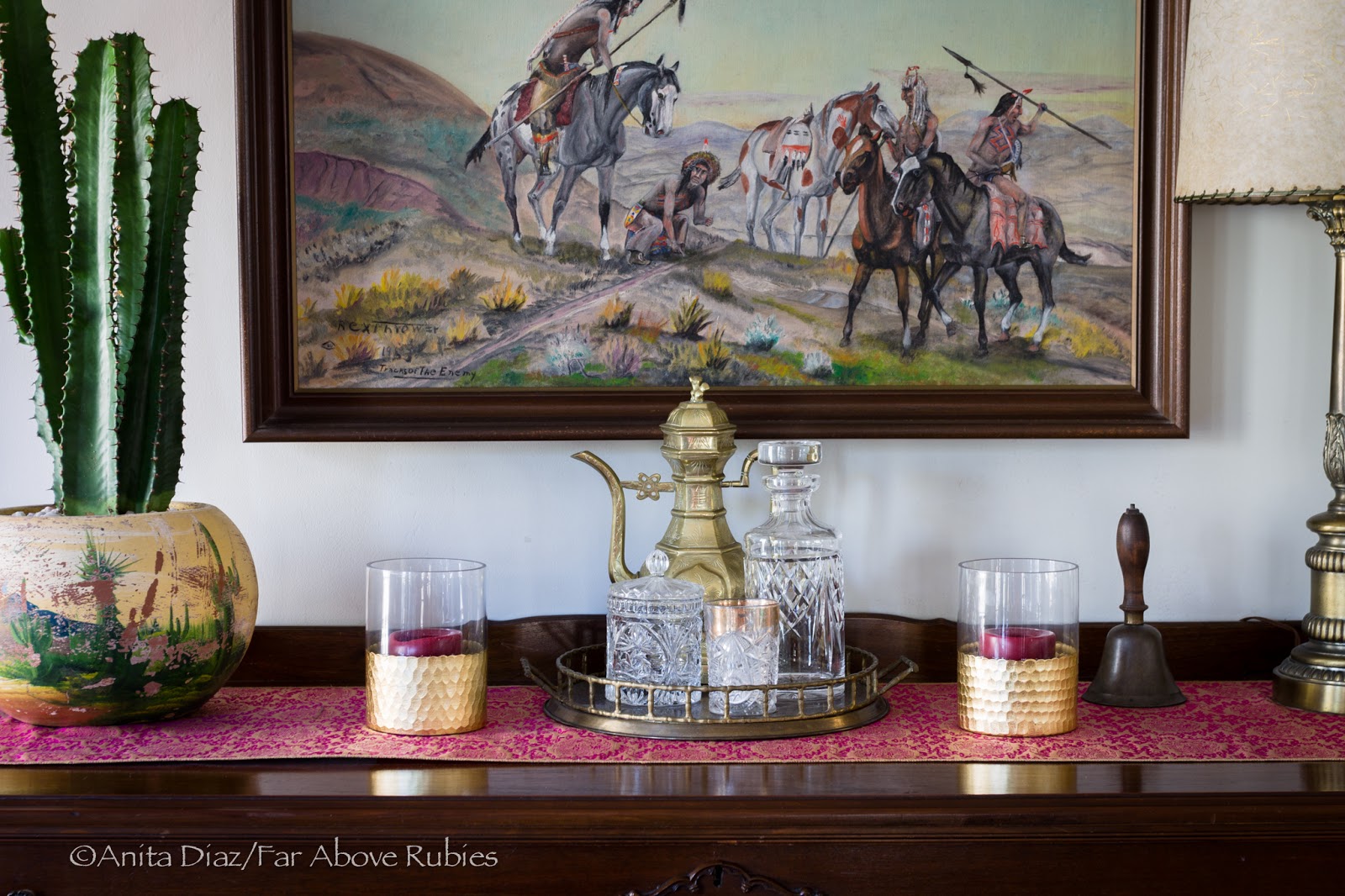 I just didn’t like the candle holders I had hanging here, (I had tried three different sets over the years), so I finally settled on these Moroccan lanterns. They came silver, so I rubbed on some gold paint because I wanted more of a brass look. I have remote controlled LED battery-powered candles that I can turn on for added ambience. I don’t need the light, because we have recessed lighting, and I don’t like the dining space too bright anyway.