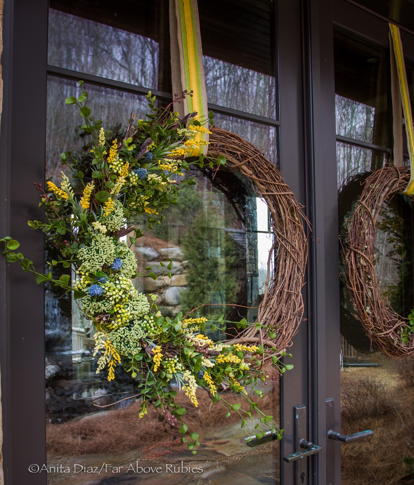 Since this house is nestled on the side of a mountain in a pristine nature preserve, I wanted these wreaths to look natural and rustic.