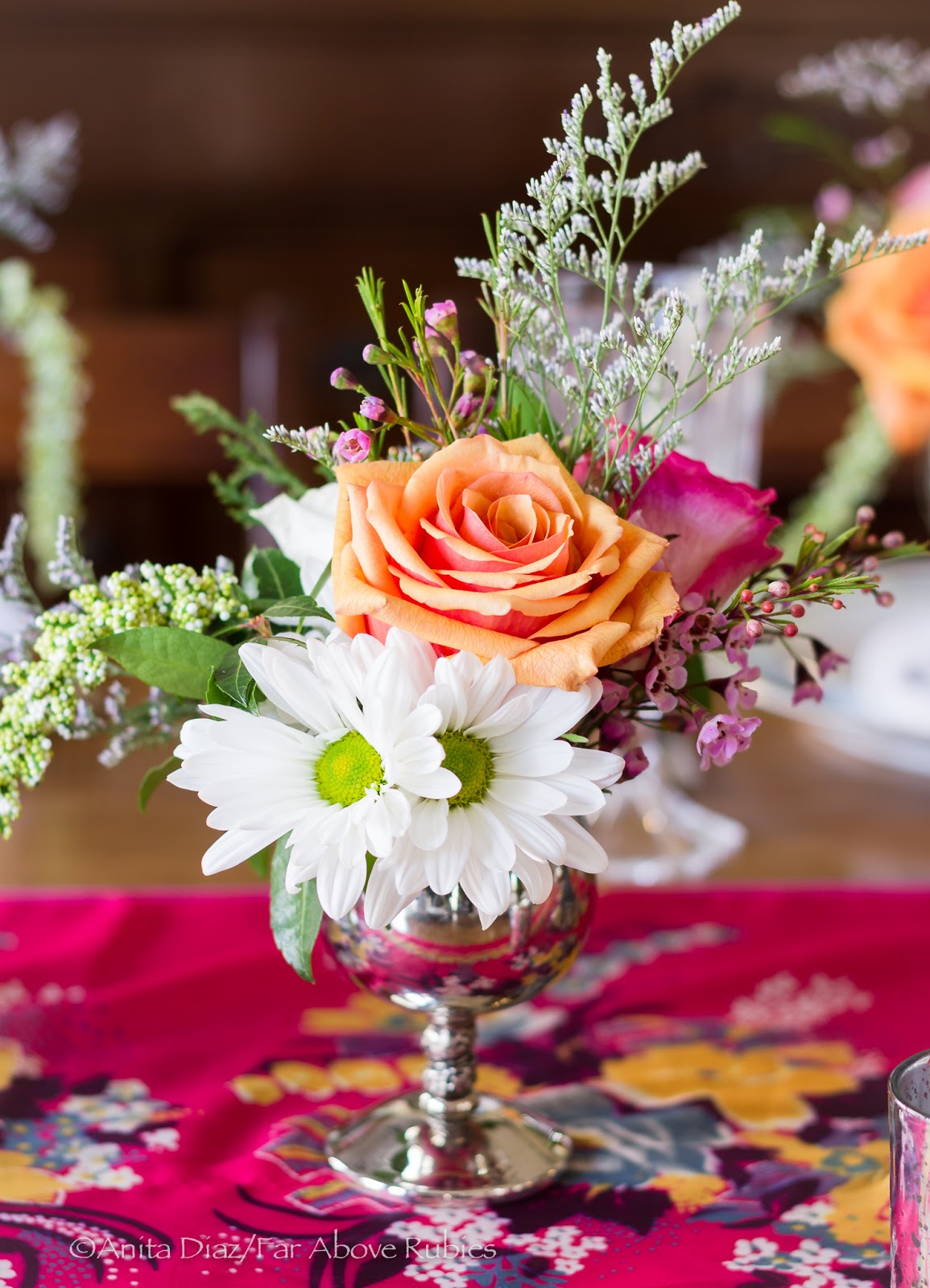 I left the arrangements in the silver punch cups and added some glass and more vintage silver.