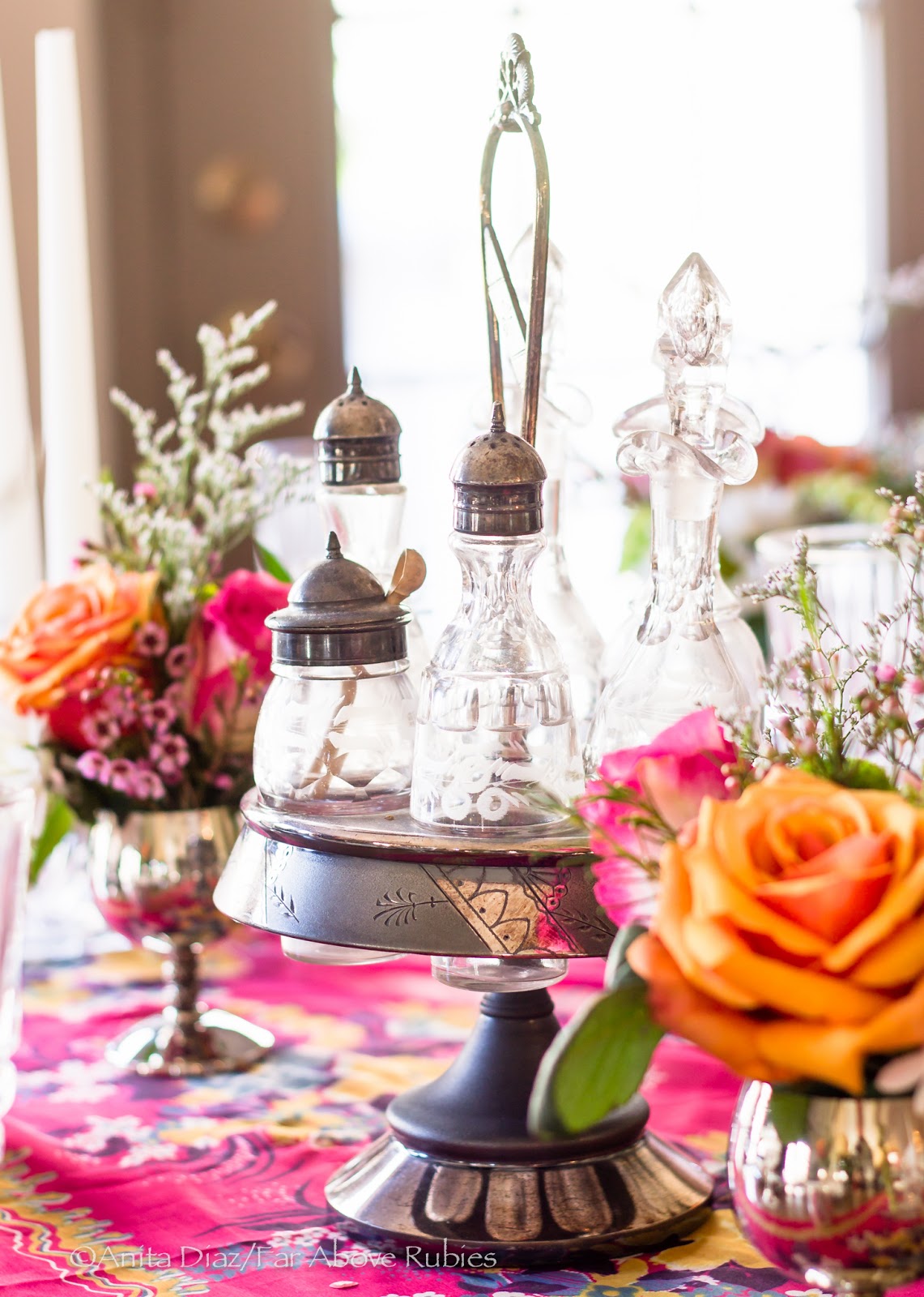 I used my great grandmother’s cruet set for the centerpiece with two small flower arrangements and vintage Fostoria Baroque candlesticks.