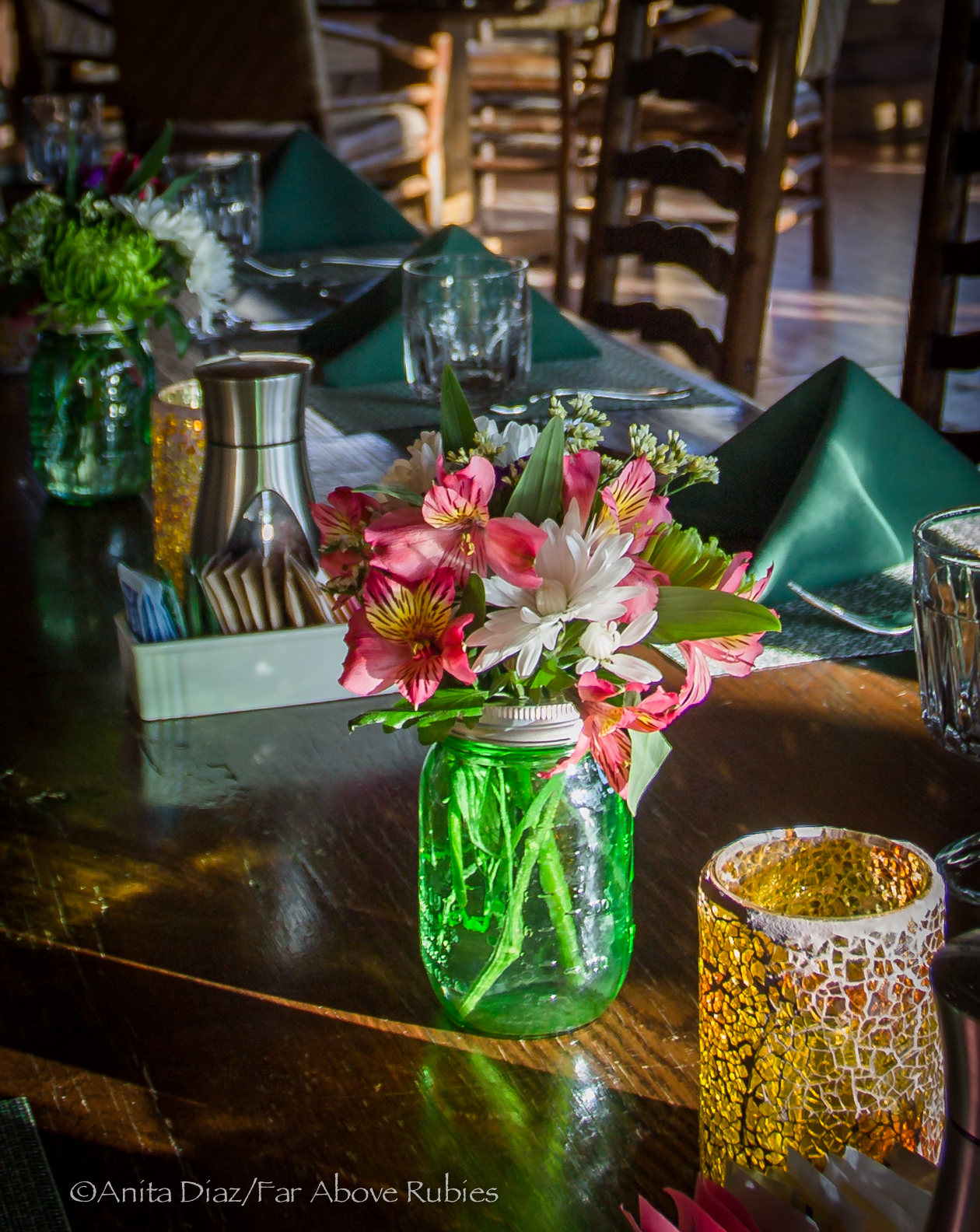 Beautiful flower arrangements, Anita! I have some of those green Mason jars, too; I need to dig them out. 😀 The Balsam Mountain Preserve is really a lovely place. I bet you have fun decorating there.