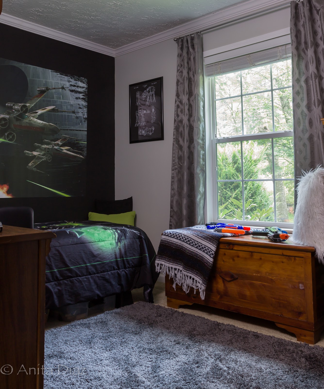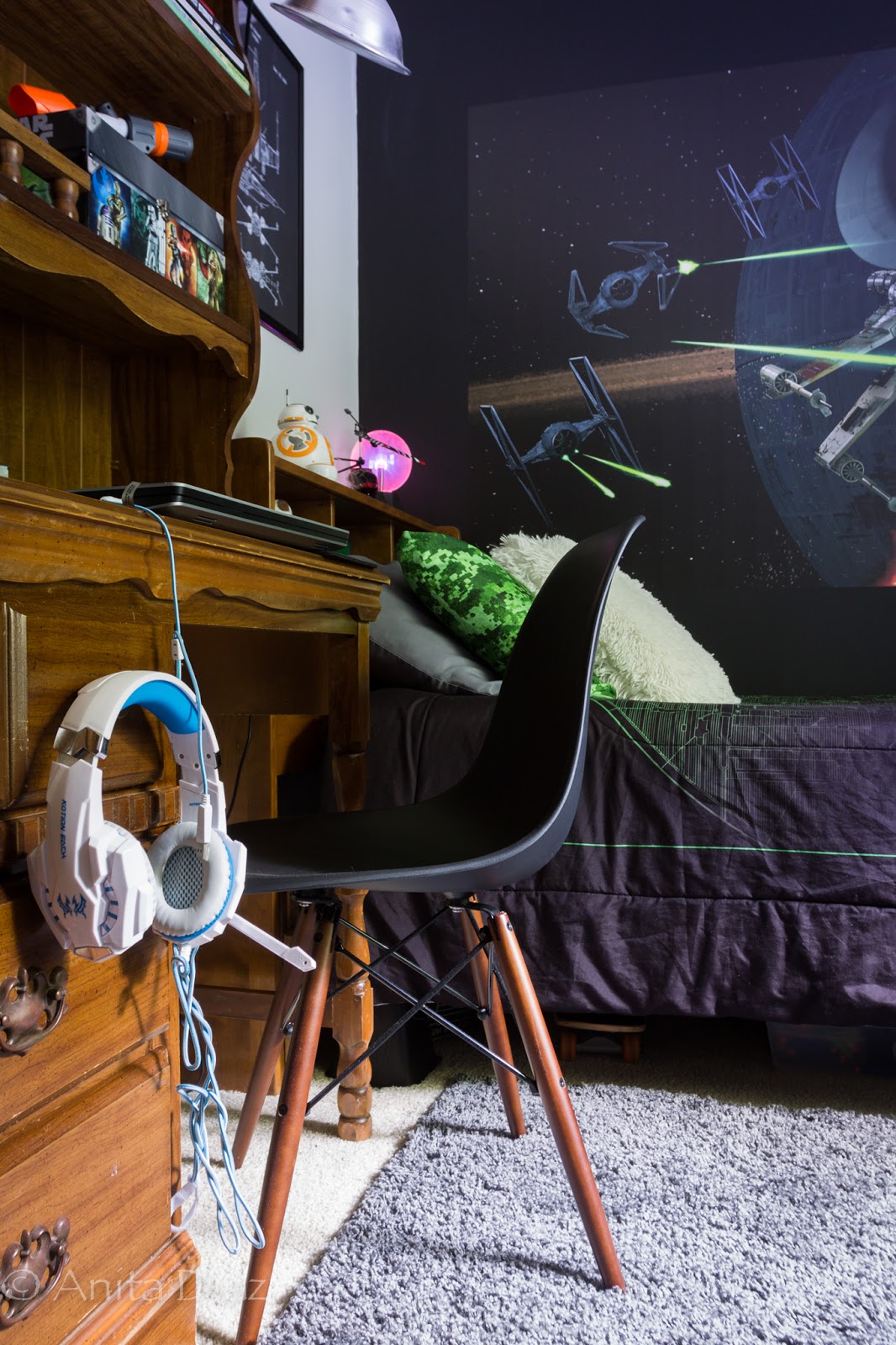 I also hung a couple of Star Wars art poster silk screen prints at each end of the bed.