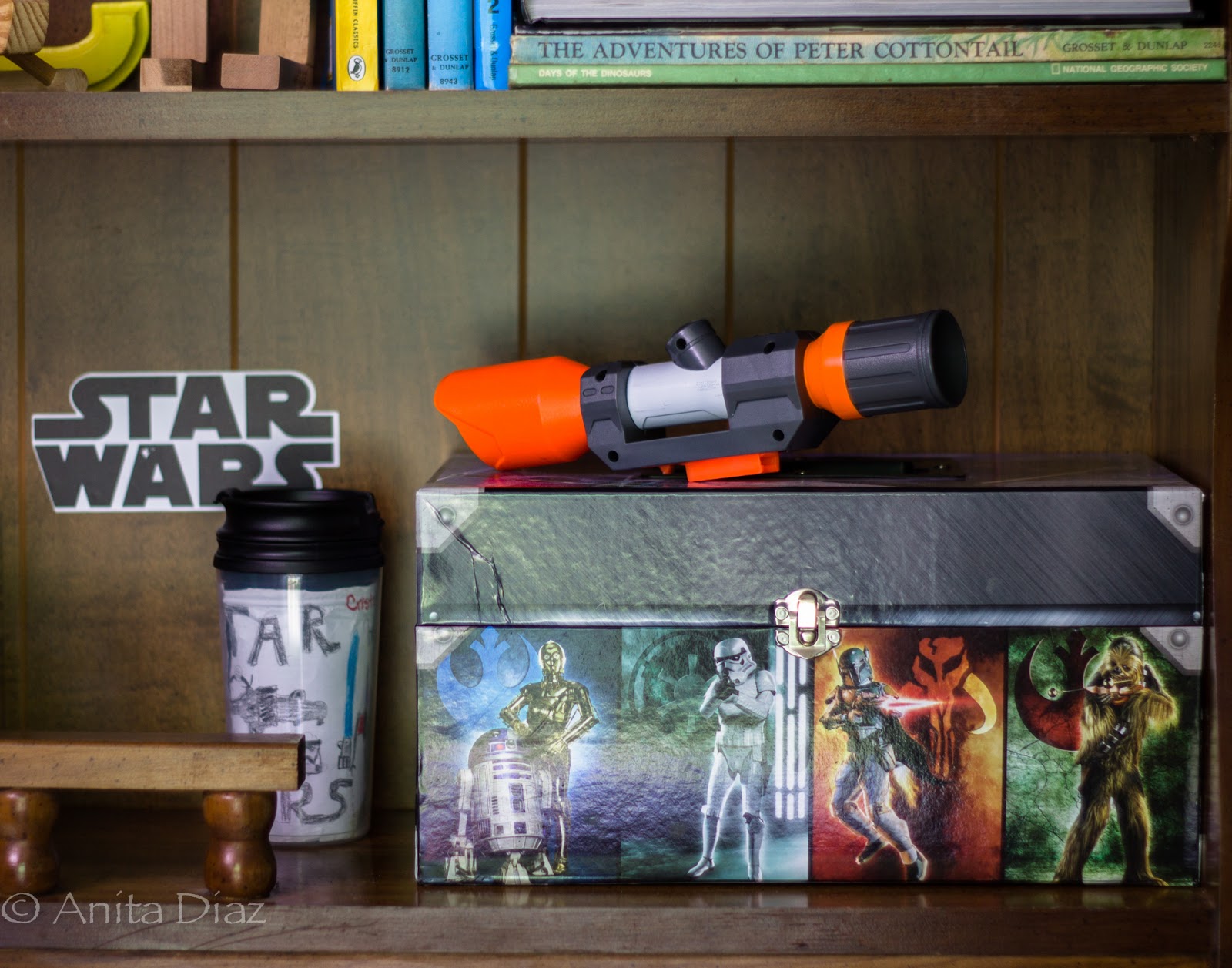 Of course, on the bookcase headboard, the BB8 droid is ready to play. This thing really has a mind of its own and will start talking at any moment.