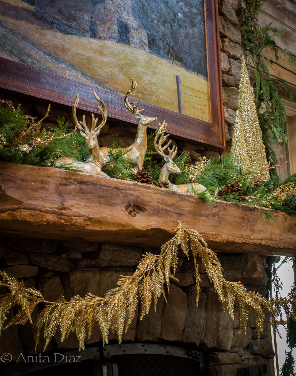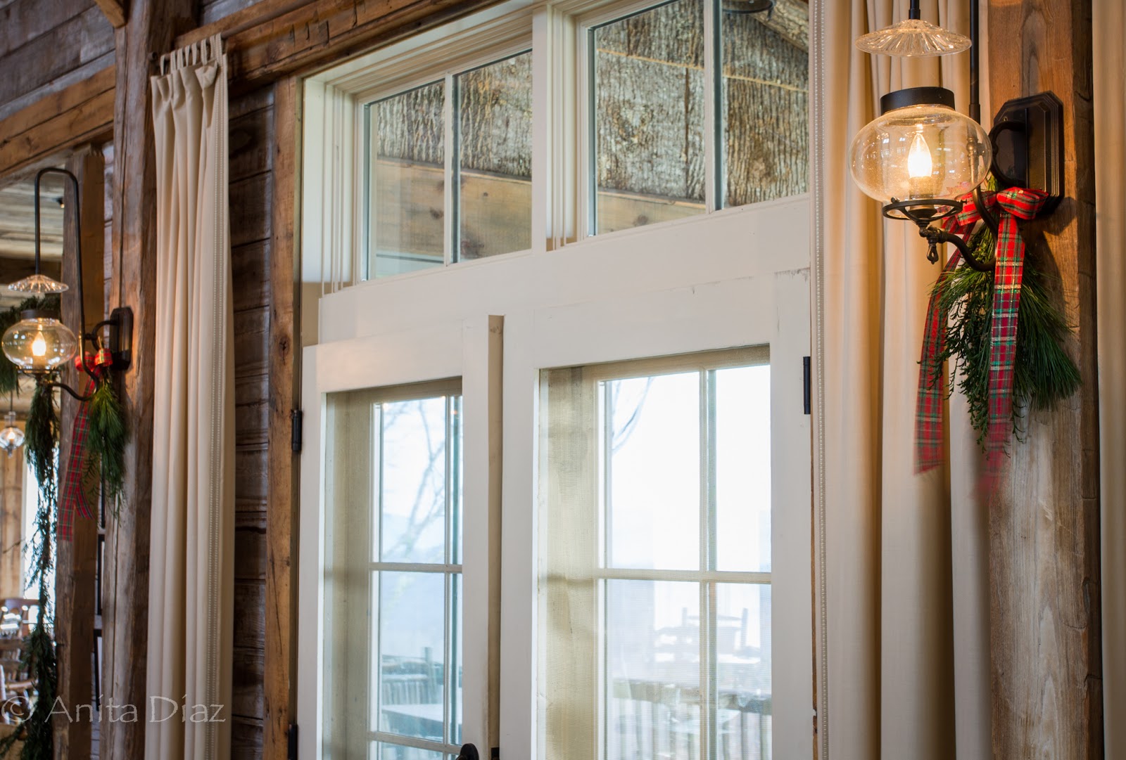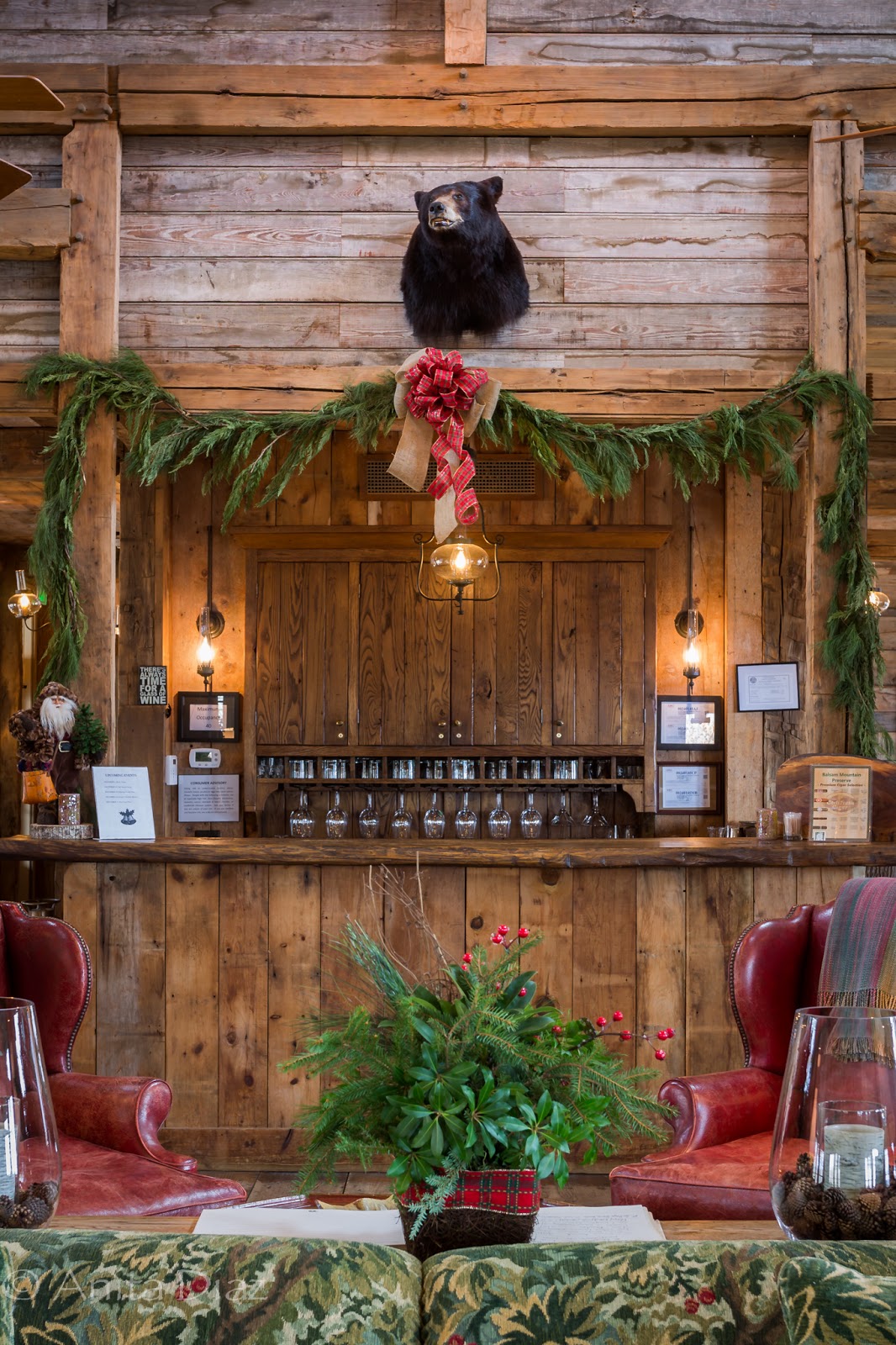 The Boarding House includes a small restaurant and is a gathering place on the mountain. Everything is already gorgeous, so all I needed to do was add some green. Now, this is the kind of place that begs for lots and lots of live garlands and rustic touches, which is what I did last year. But, it’s also warm inside, and I found last year that live greens dry super fast. In a commercial space with three fireplaces, that can be a recipe for disaster. Keeping that in mind, I dialed the live greens back a bit and added in some faux garlands I found at Hobby Lobby.