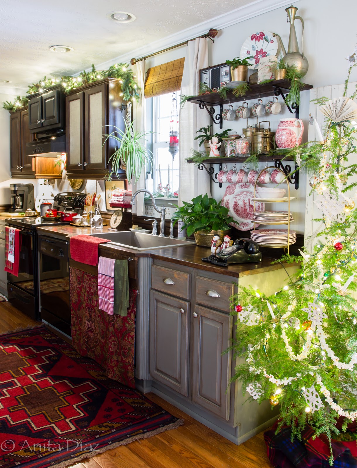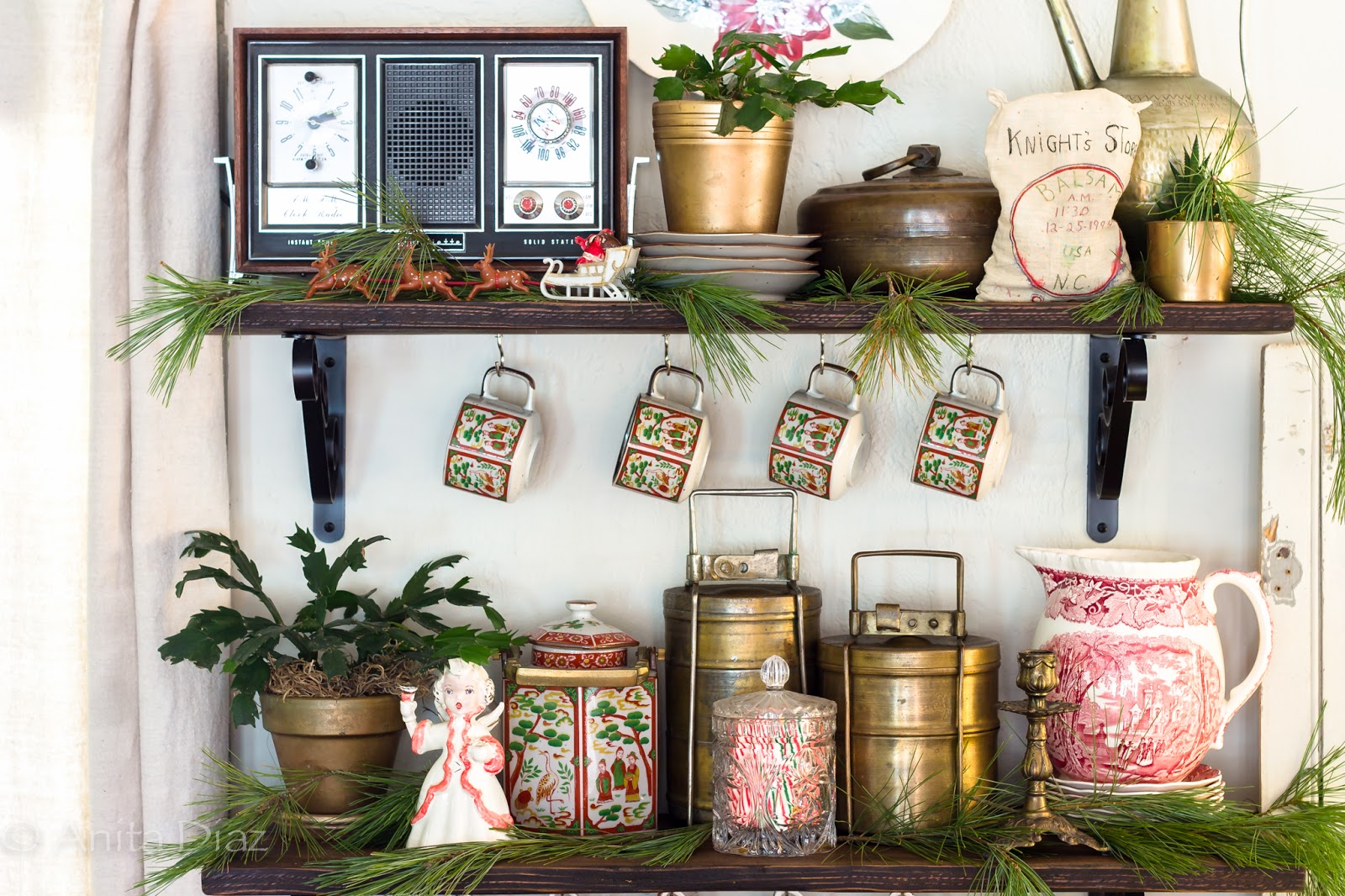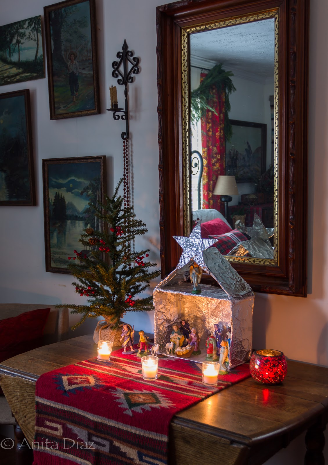 Wow Anita- your home is full of love and wonderful memories. I didn’t realize that this was your home when you showed the living room with the wreaths in the windows on Facebook. I love the colorful textiles and the beautiful rug. There are so many details I enjoyed going through your pictures. That aluminum foil nativity is a real treasure. What a blessing to live on the property of your grandparents. Wishing you a Very Merry Christmas!