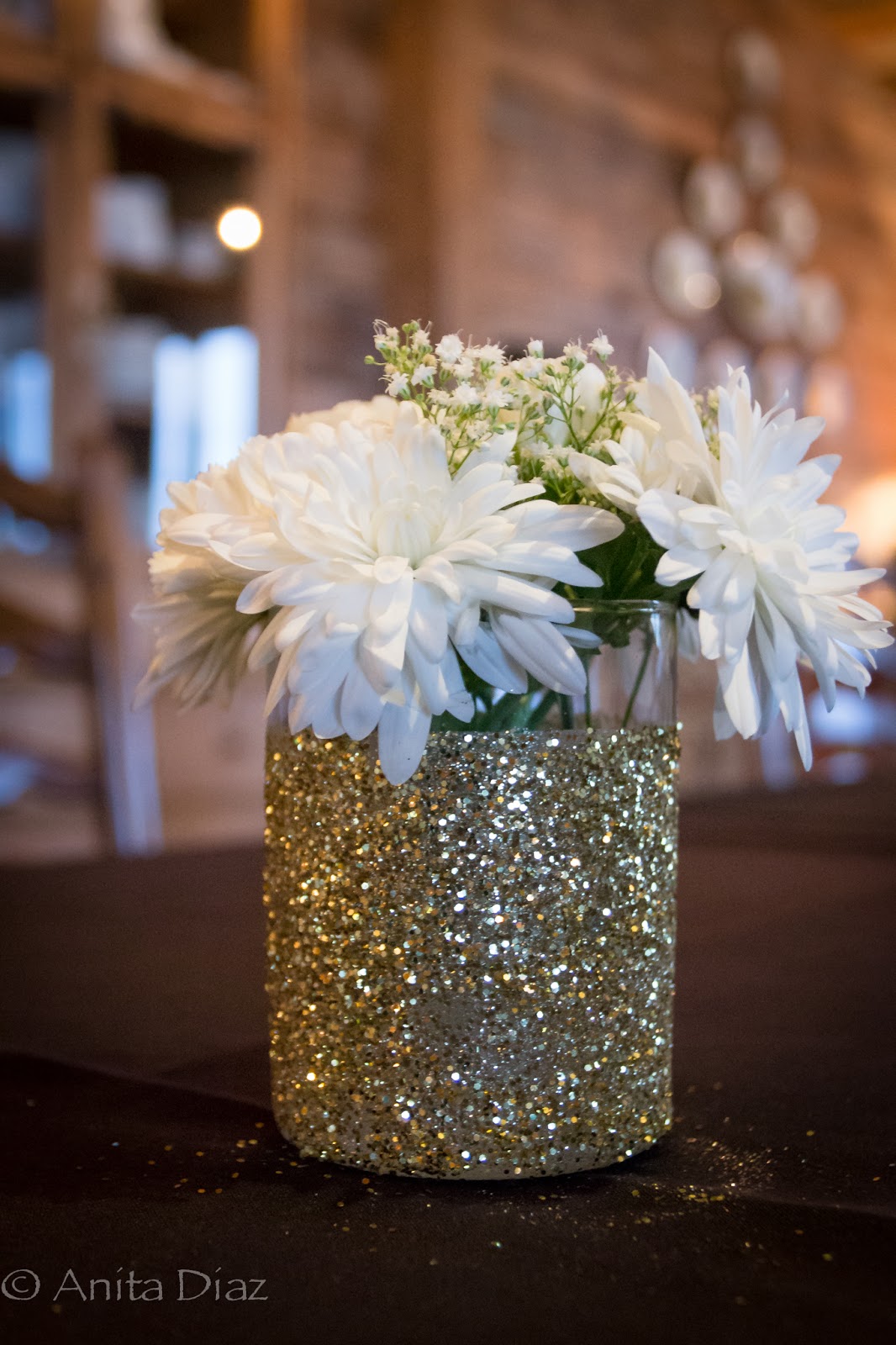 I bought clear vases, taped off the edges, then brushed on glue and sprinkled on gold glitter for a sparkly, fun look.
