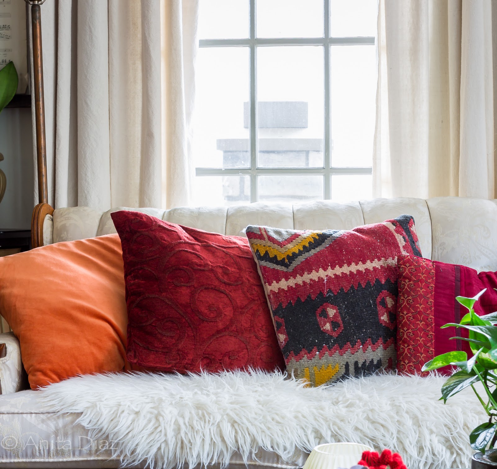 Sorry, Anita, but I'm not a fan of the red patterned chairs. I'm so in love with your homespun fabric and kilim pillows and your georgous brightly colored woven rugs that I resent the chairs taking away the attention from those pieces. They appear old fashioned to me, but maybe that's a positive for you since they come from family. I think the recliners would look amazing and would offer no competition to the otherwise outstanding native handwoven look you've made work so well.