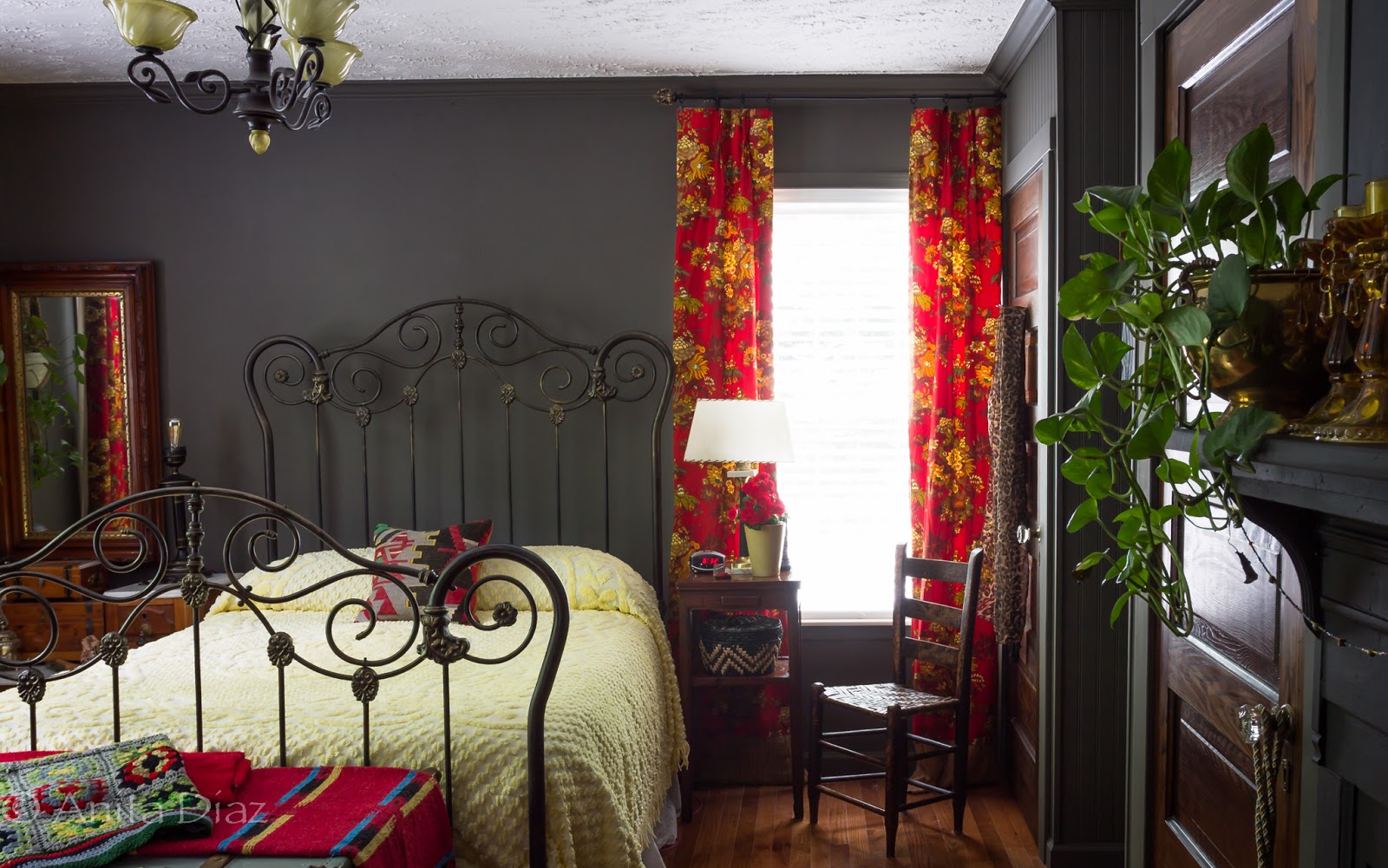 Here’s a little peek at the master bedroom. I borrowed this yellow chenille bedspread from my mom, then found another one in a different color I liked even better, so I’ll blog this space with its new look later.😊