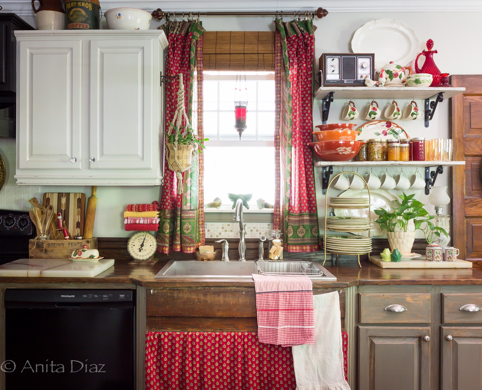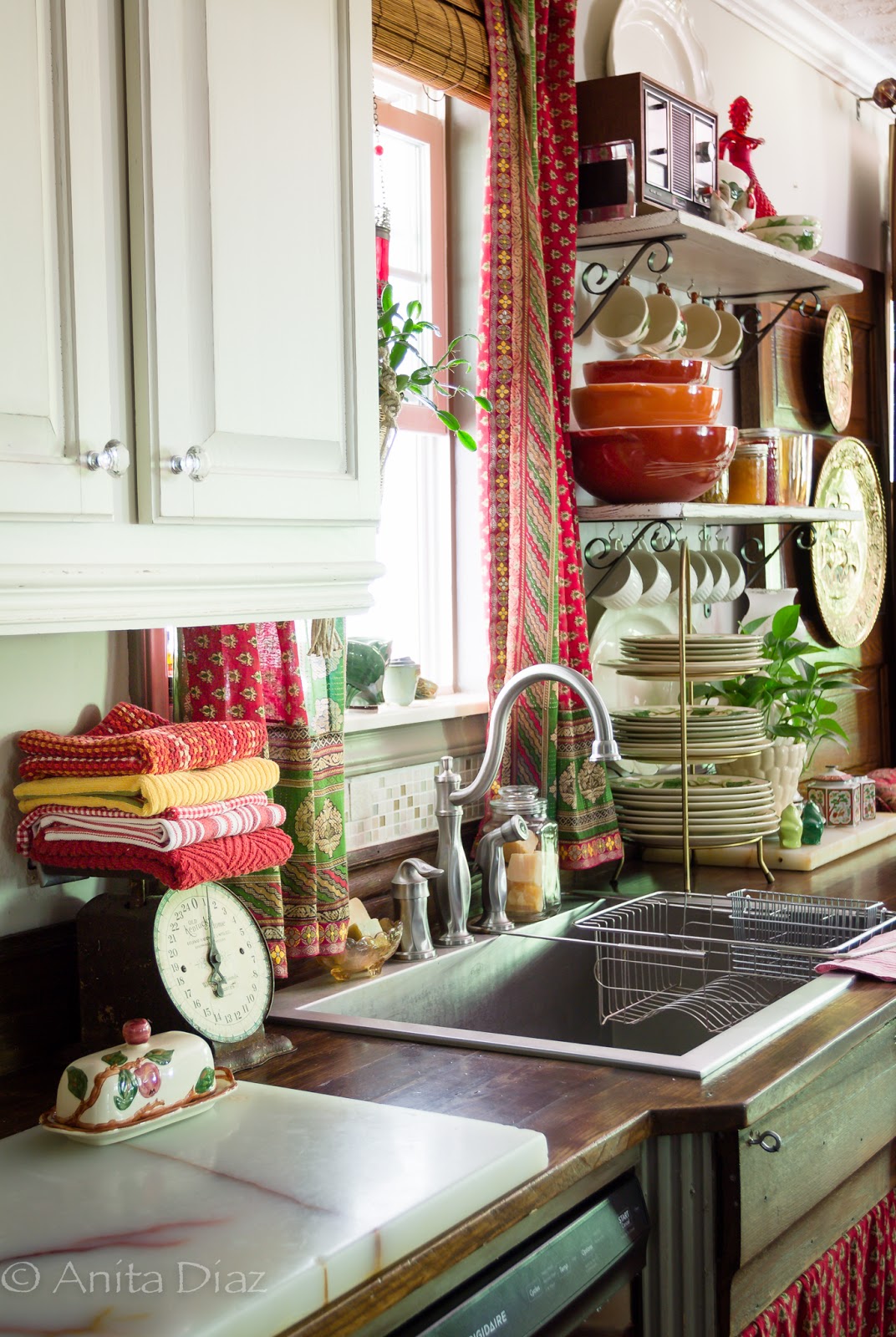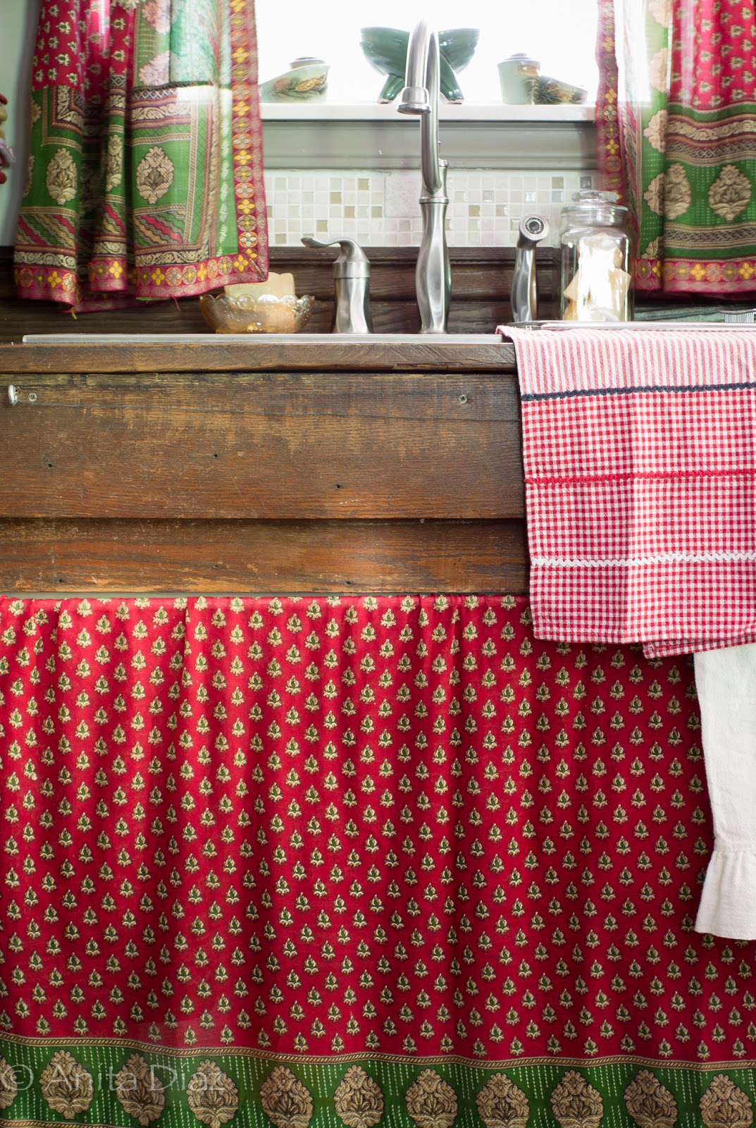 I’m still loving the curtains and sink skirt I made from a vintage Indian sari, and the pop of color they add to the kitchen.