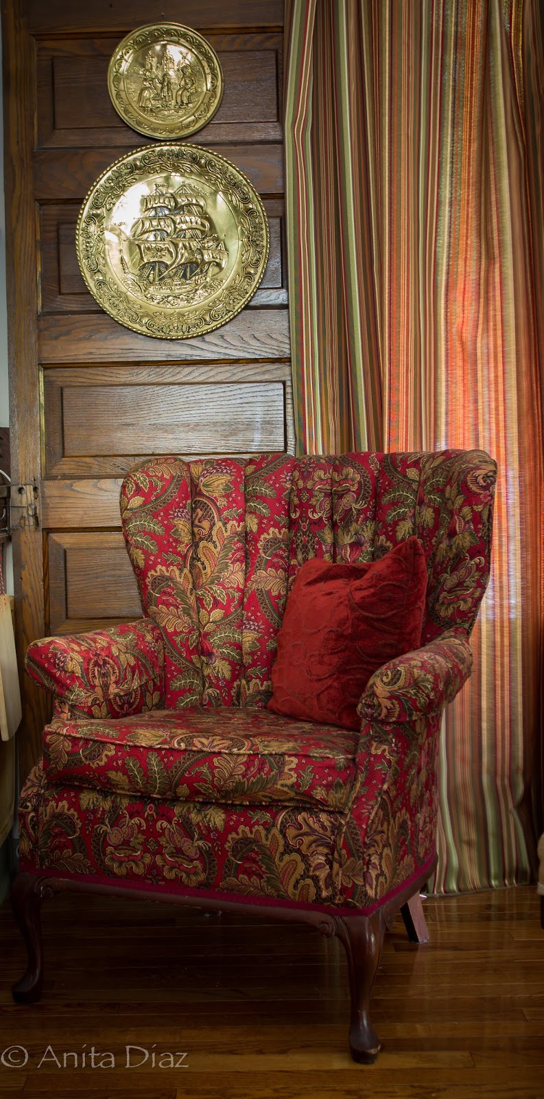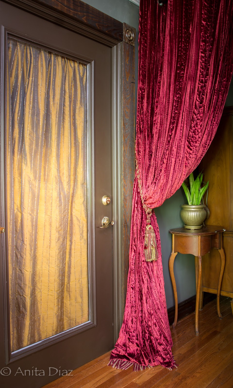 I rescued these portieres from an old building here some friends owned before it sold. The other side is red velvet, and I used the other matching panel in my hallway.