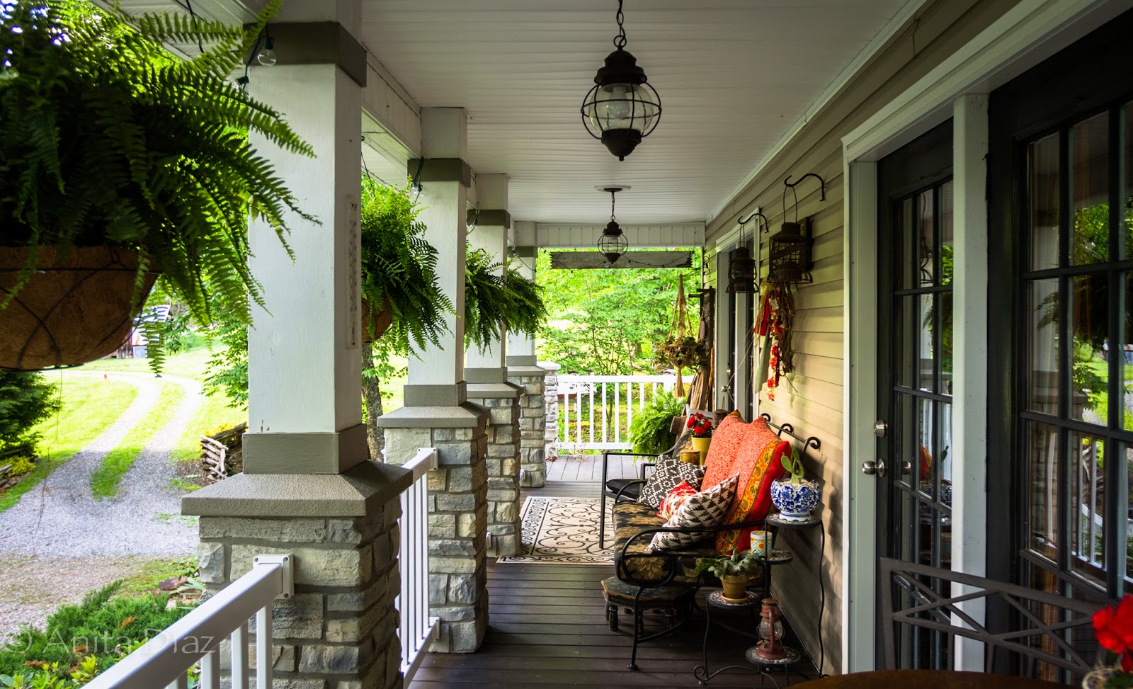 I try to keep things true to the mountain area we live in and to the property as well with a little bit of farmhouse style combined with the Victorian style of the buildings, comfy seating, hanging ferns and lots of color.