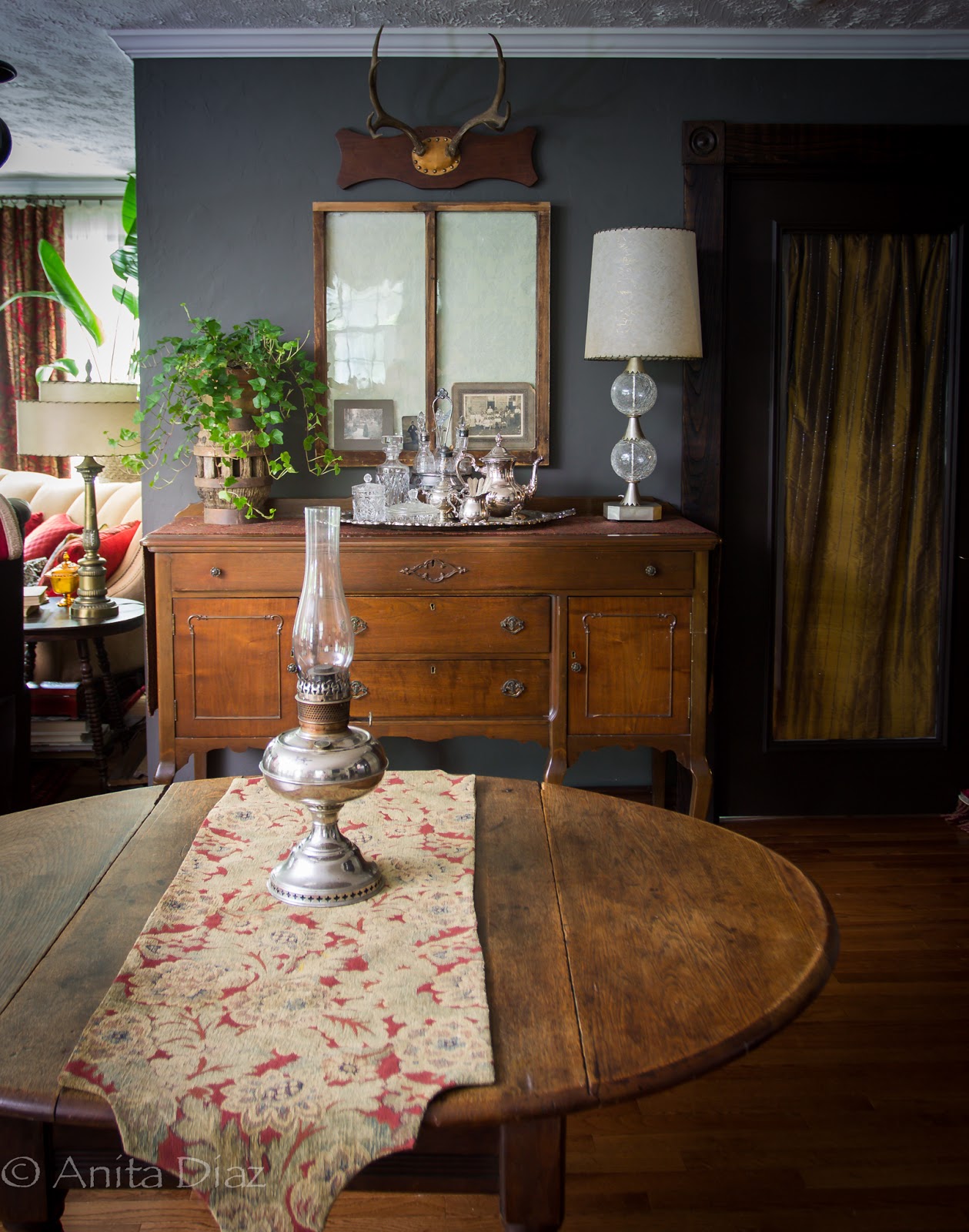 And just because I wanted to try it, I moved my large table out and brought in the antique dropleaf that belonged to my great grandfather. His oil lamp sits on the table.