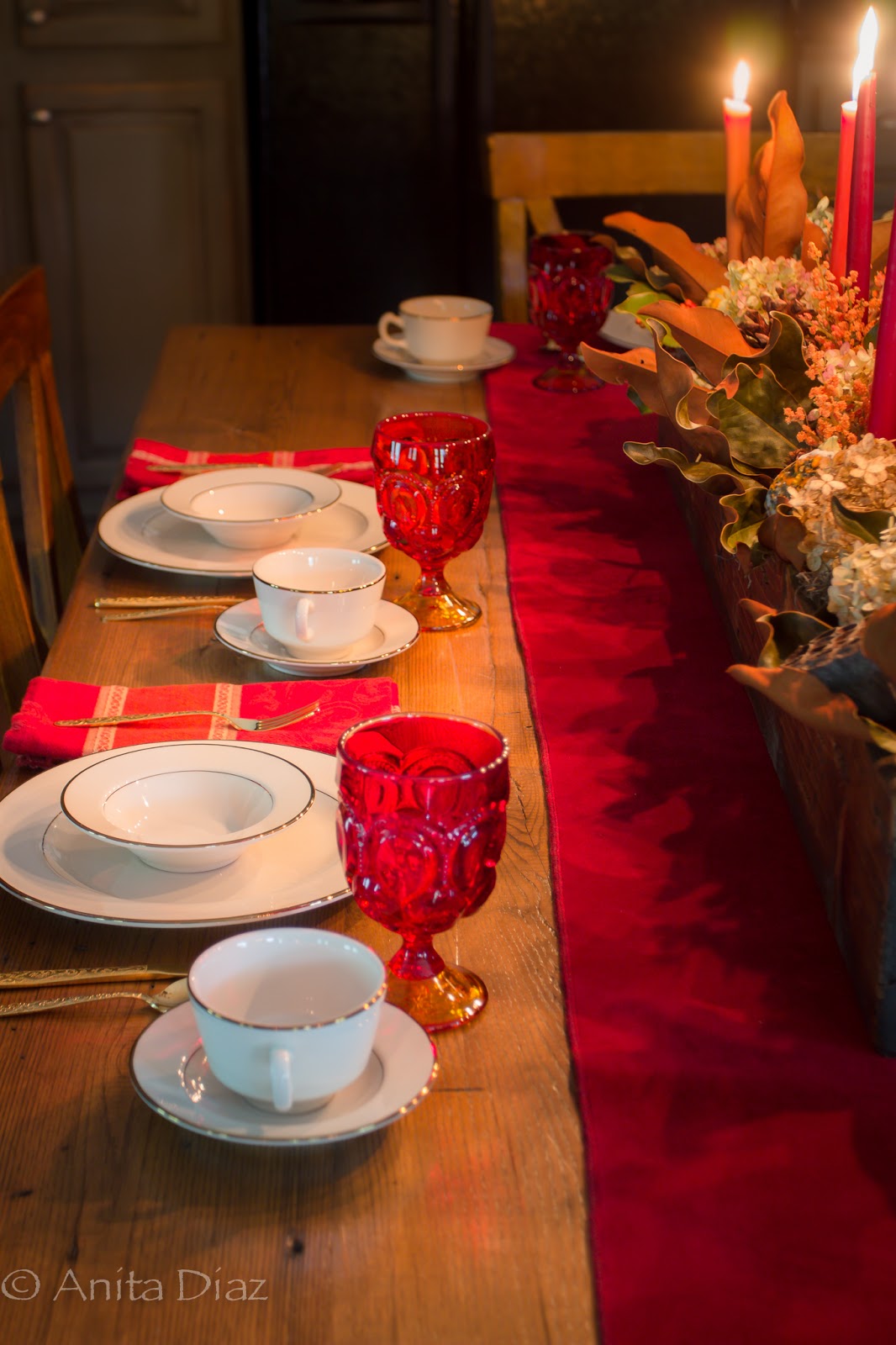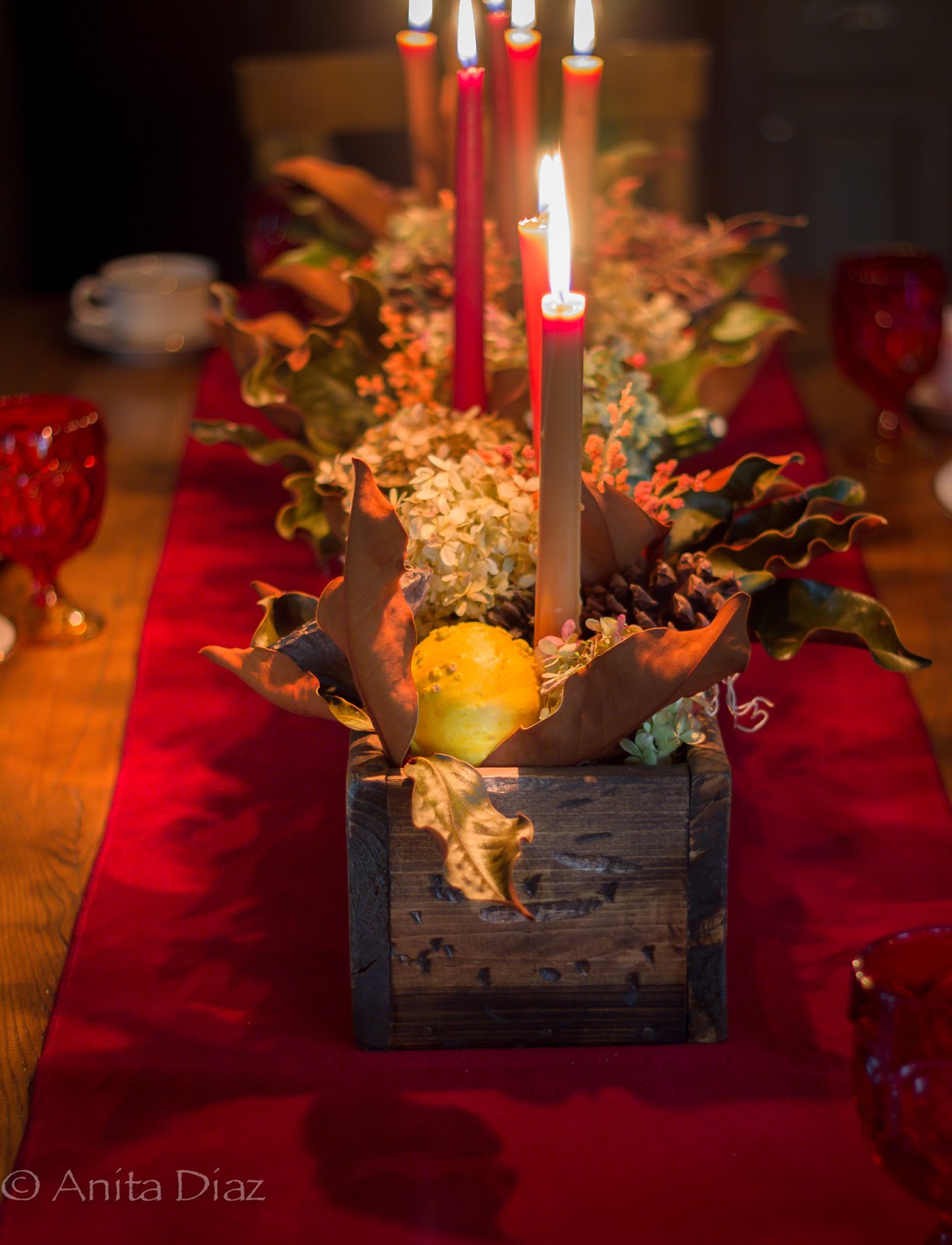 Candle light, velvets and foliage are great ways to bring the outside in and are things you can use that won’t cost much money, if any at all.