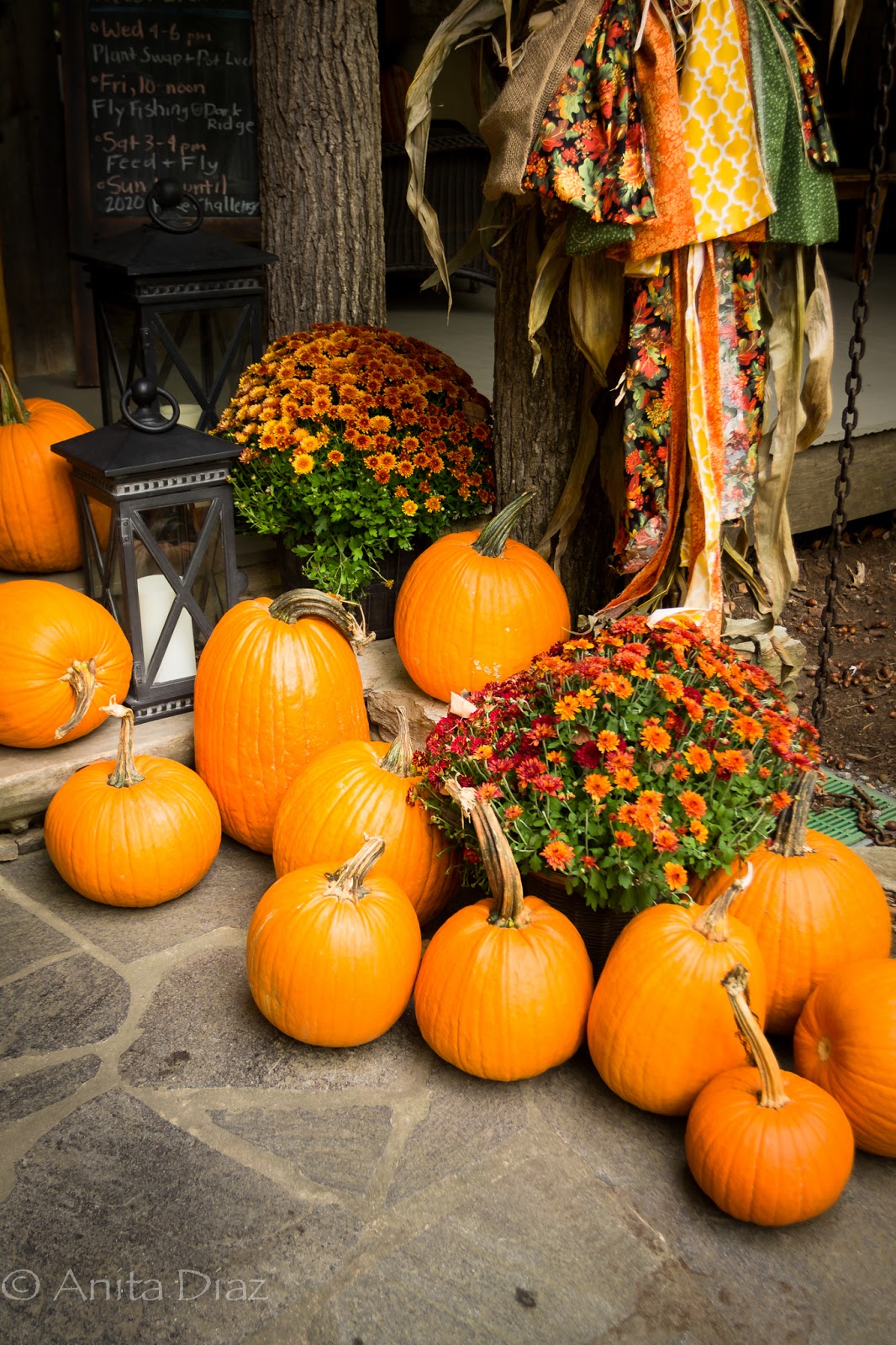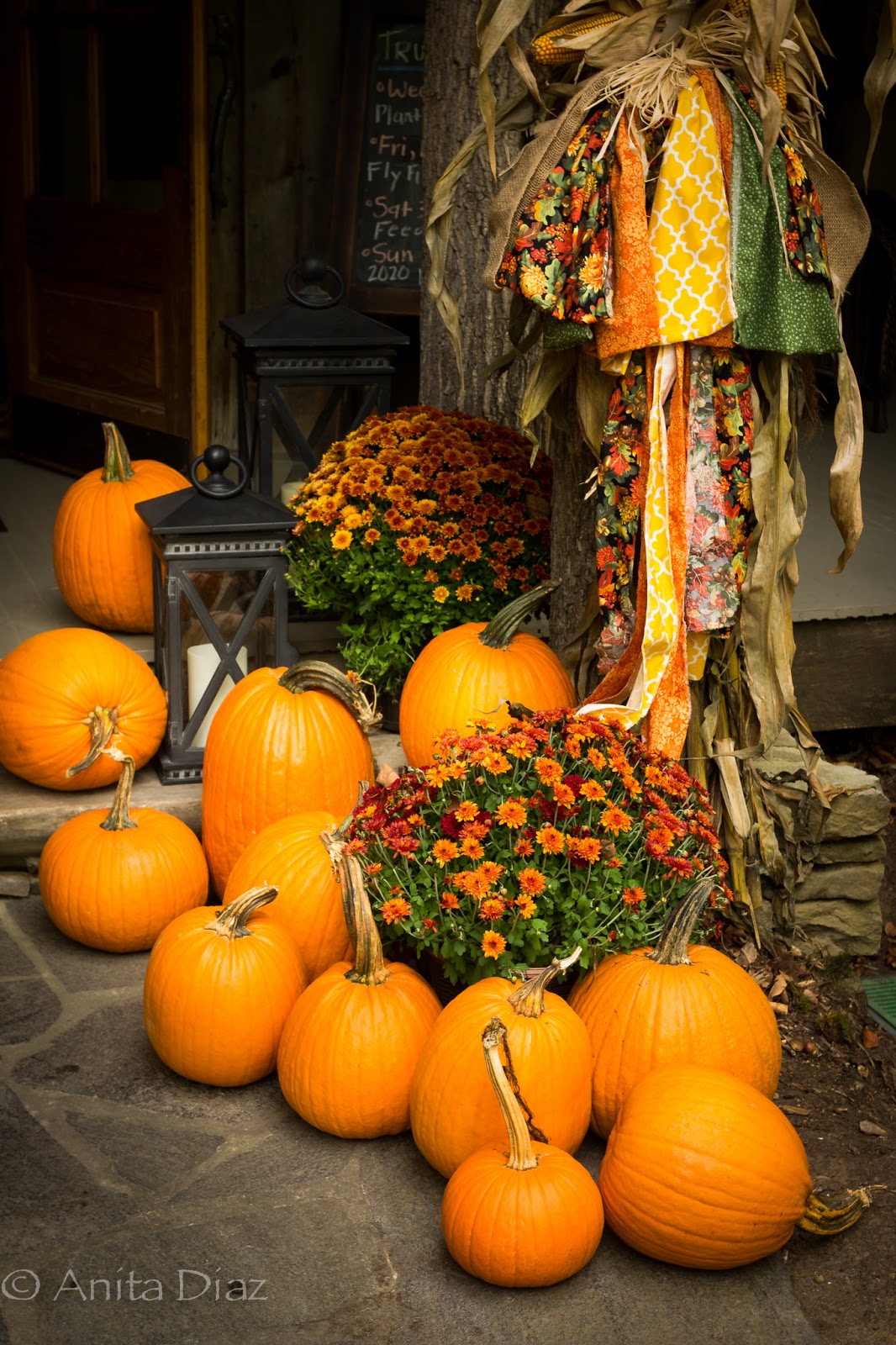 I love the way you have decorated your front porch and door area. Your ribbons tie all of the colors of the pumpkins, corn stalks, and mums together. Your entry is aglow with Fall!