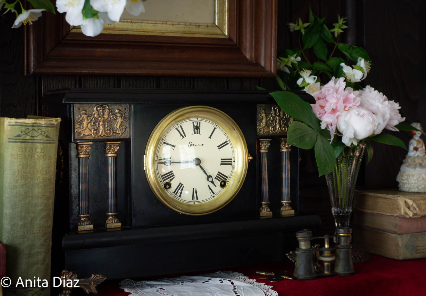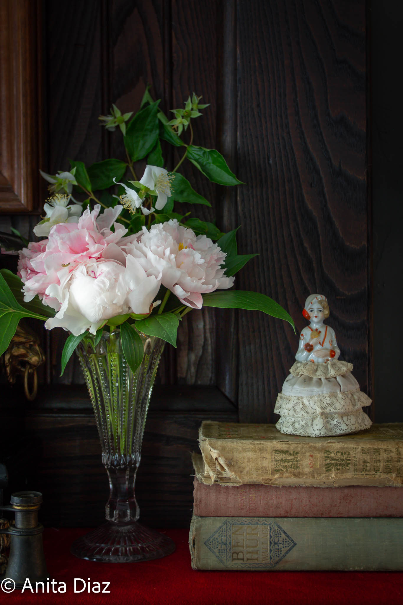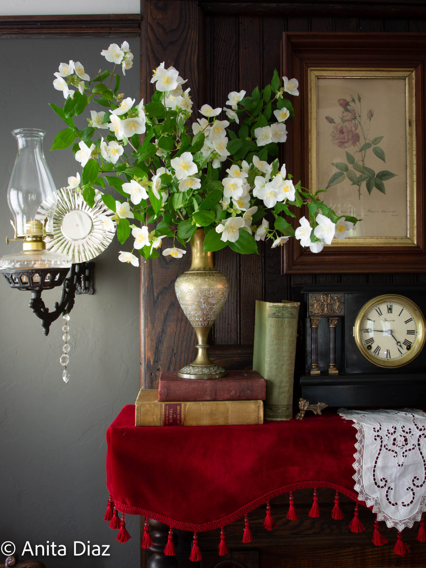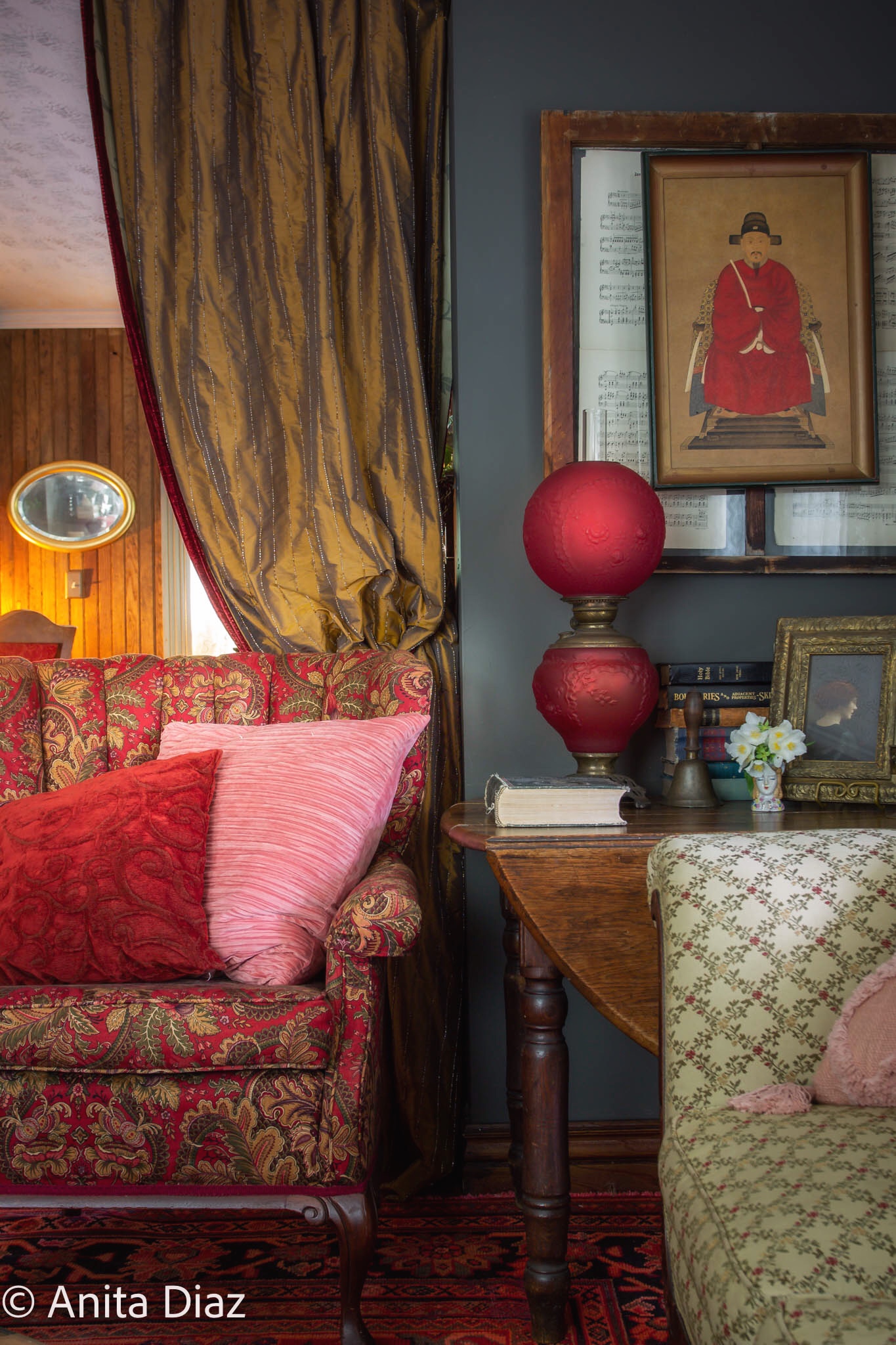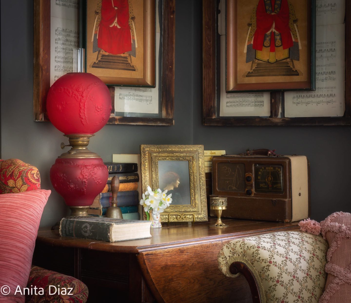 The drop leaf table belonged to my great grandfather, the 1940s radio to my great grandmother pictured here in a 1921 photo. The books belonged to my grandfather, who was a teacher and surveyor, and he used the bell to call his students to order. The Chinese ancestor prints are inherited from another relative and hang on windows from the old house. The oil lamp is from the late 1800s and was a gift to my mother.