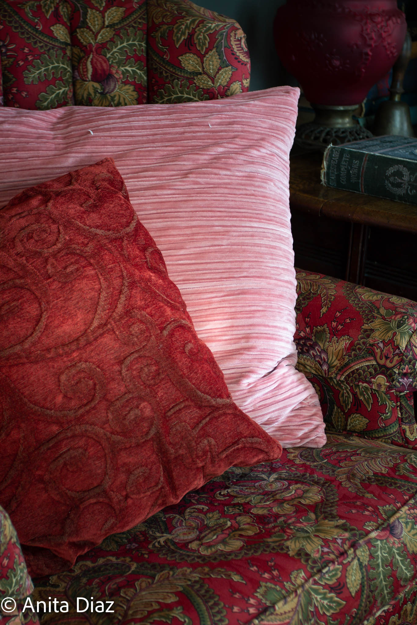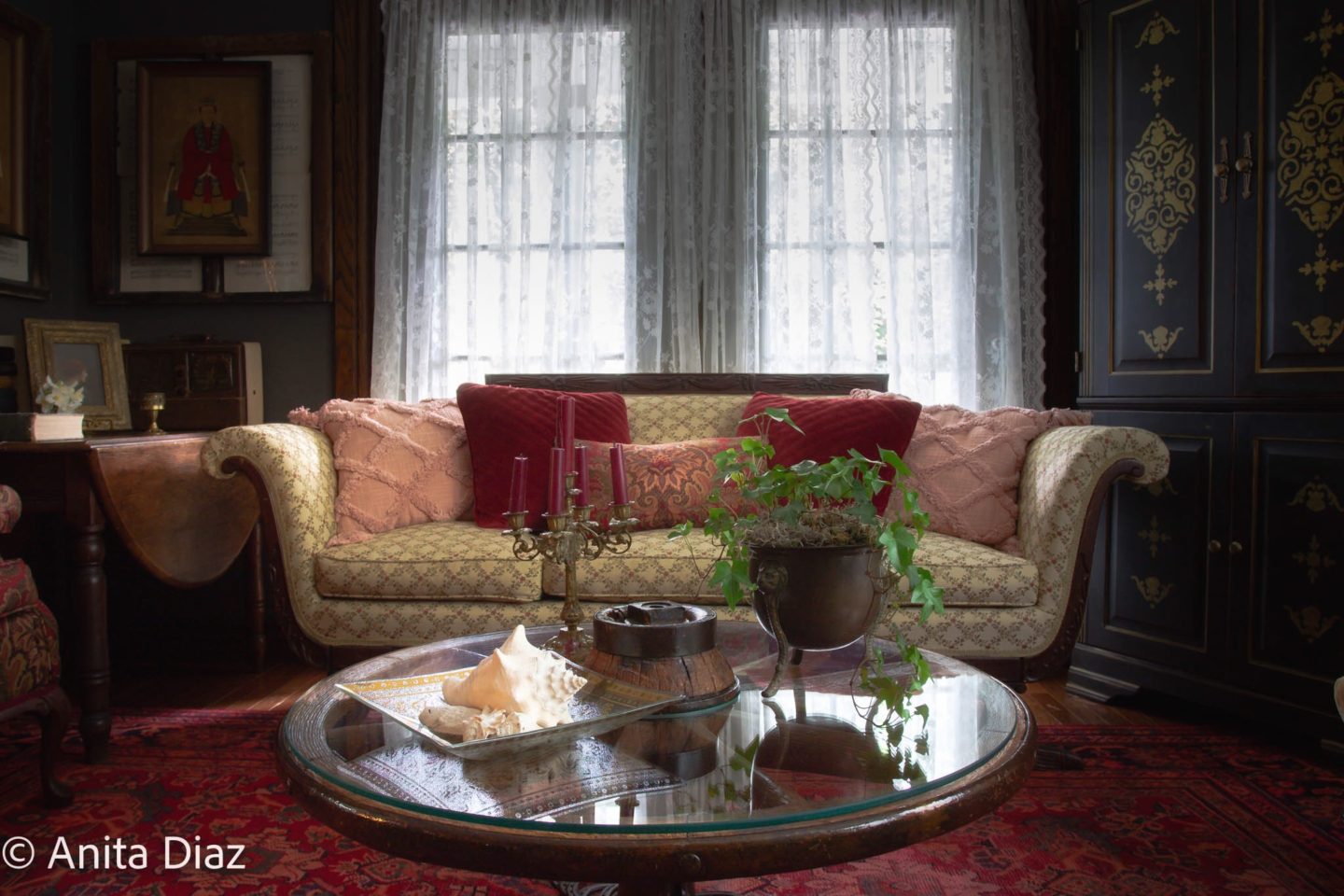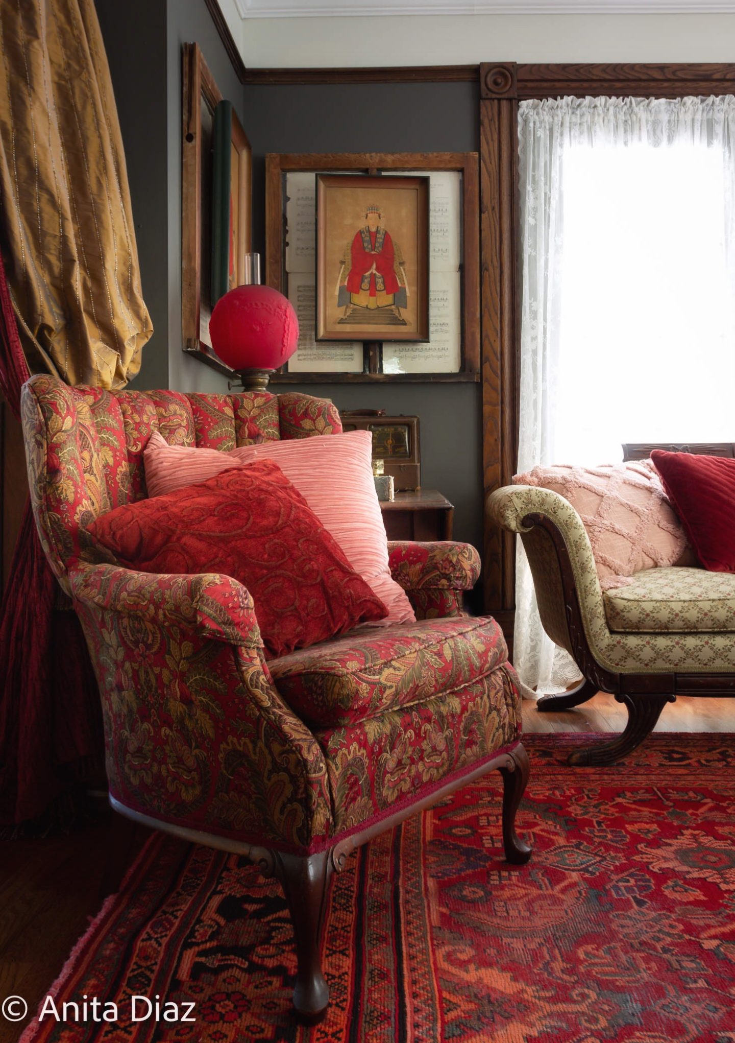 Because this vintage Persian rug has several shades of red, peach and coral, the pink shades work well with it. I covered great grandmother’s table with linen floral fabric and topped it with a pink/coral taffeta. I love this bit of fancy, and it helps tie a lot of the other color elements in the room together.