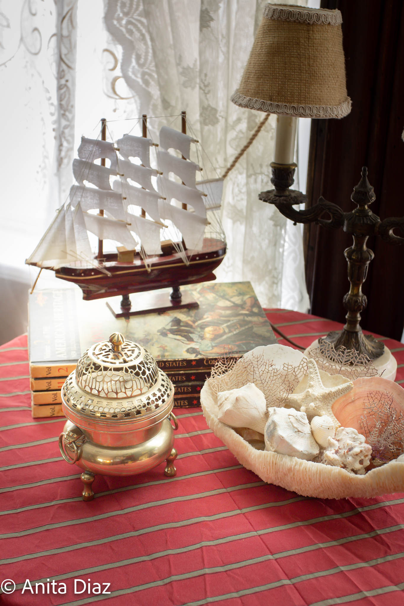 I added a few more nods to my grandmother’s Florida heritage with more of her shell collection, and a cute sail boat we found while on vacation several years ago. The brass incense burner is antique and also inherited.