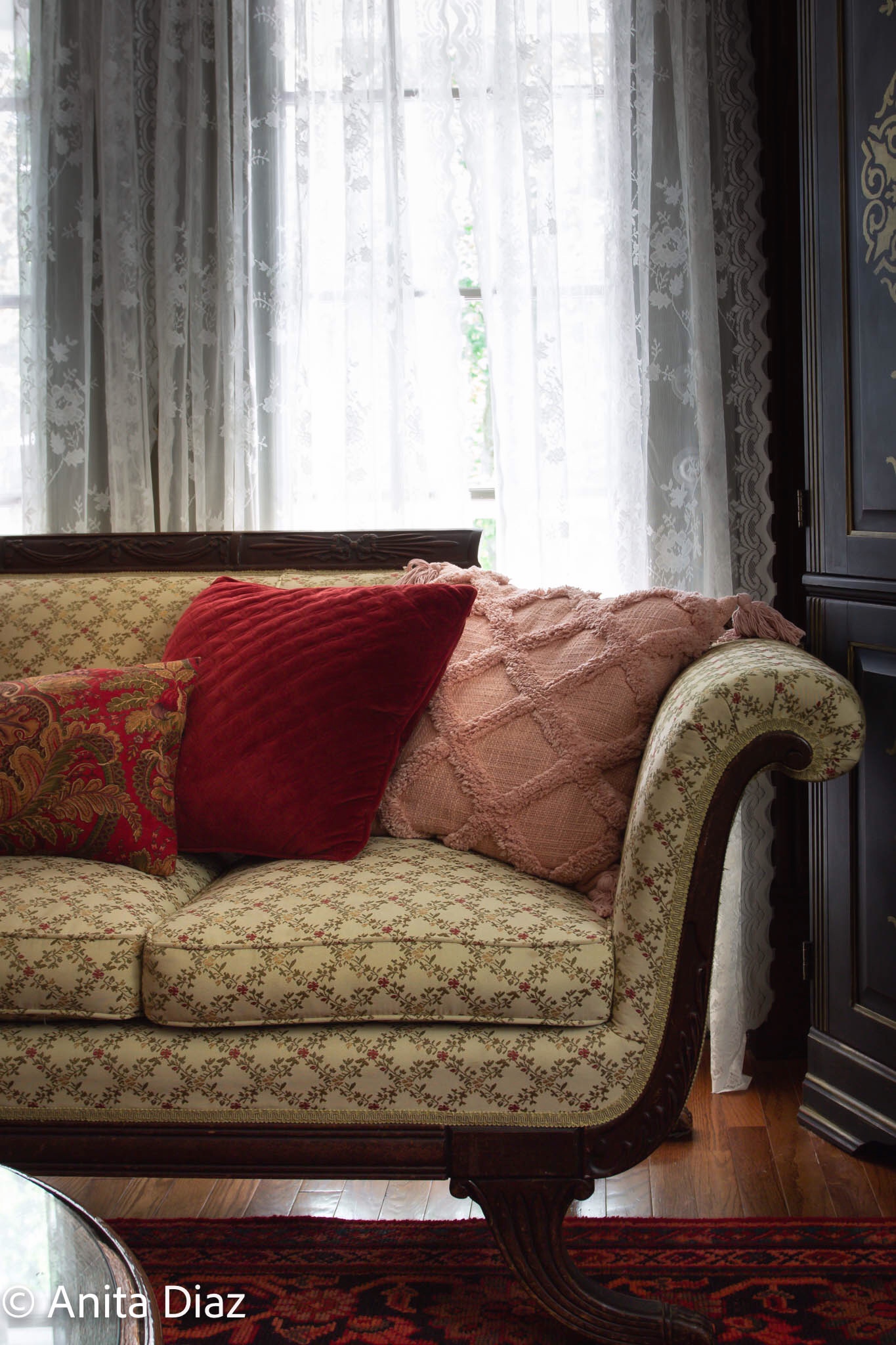 I did lighten things up because the many trees shading and keeping the house cool, also make it darker in the summer. I packed away the red velvet Lambrequins and paisley drapes and left just the cream lace sheers. I love the way they filter light, and for this room, we really don’t need anything else.