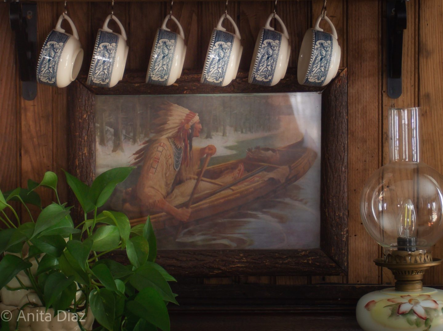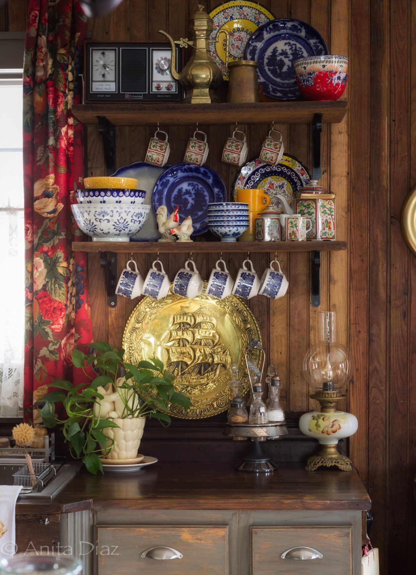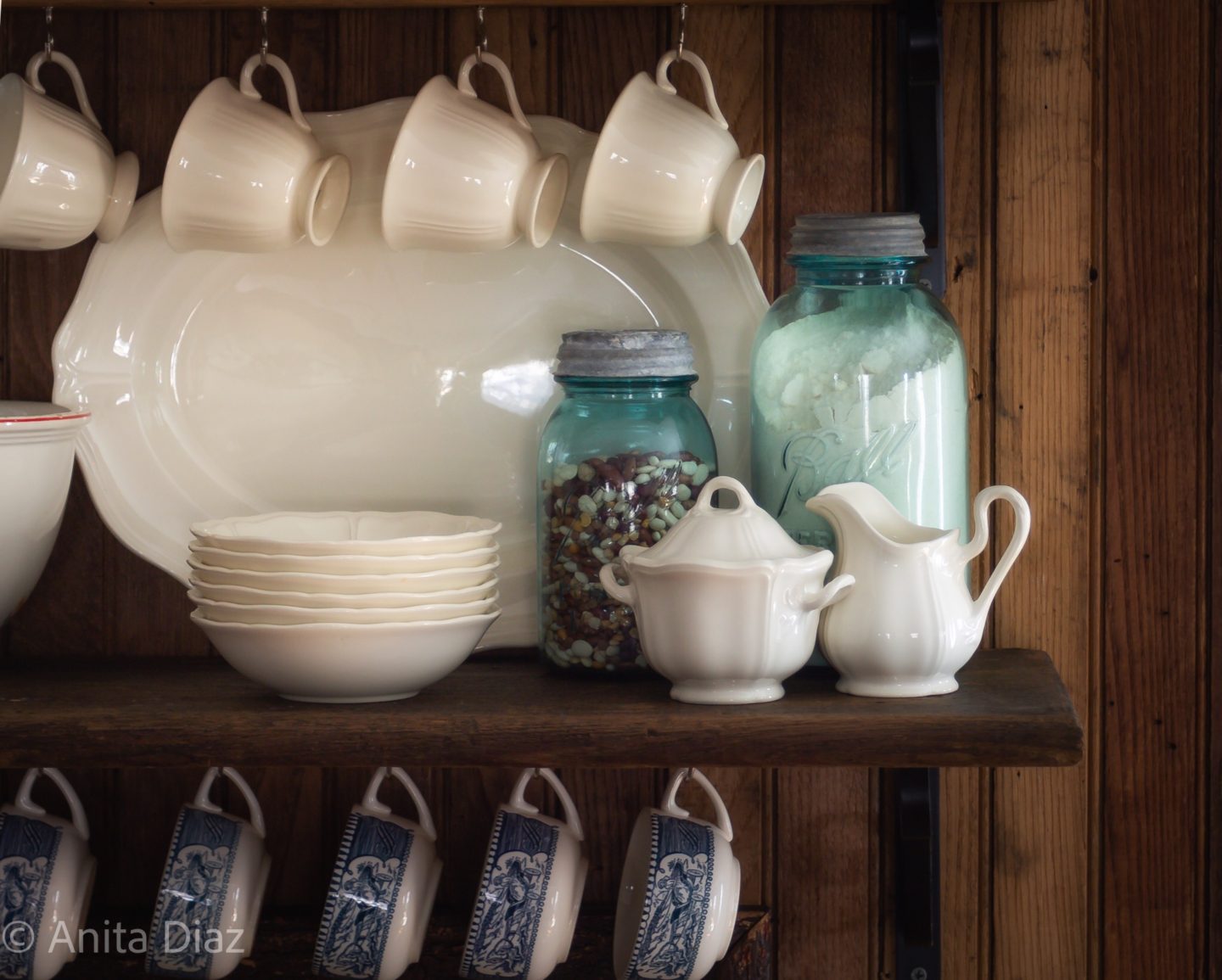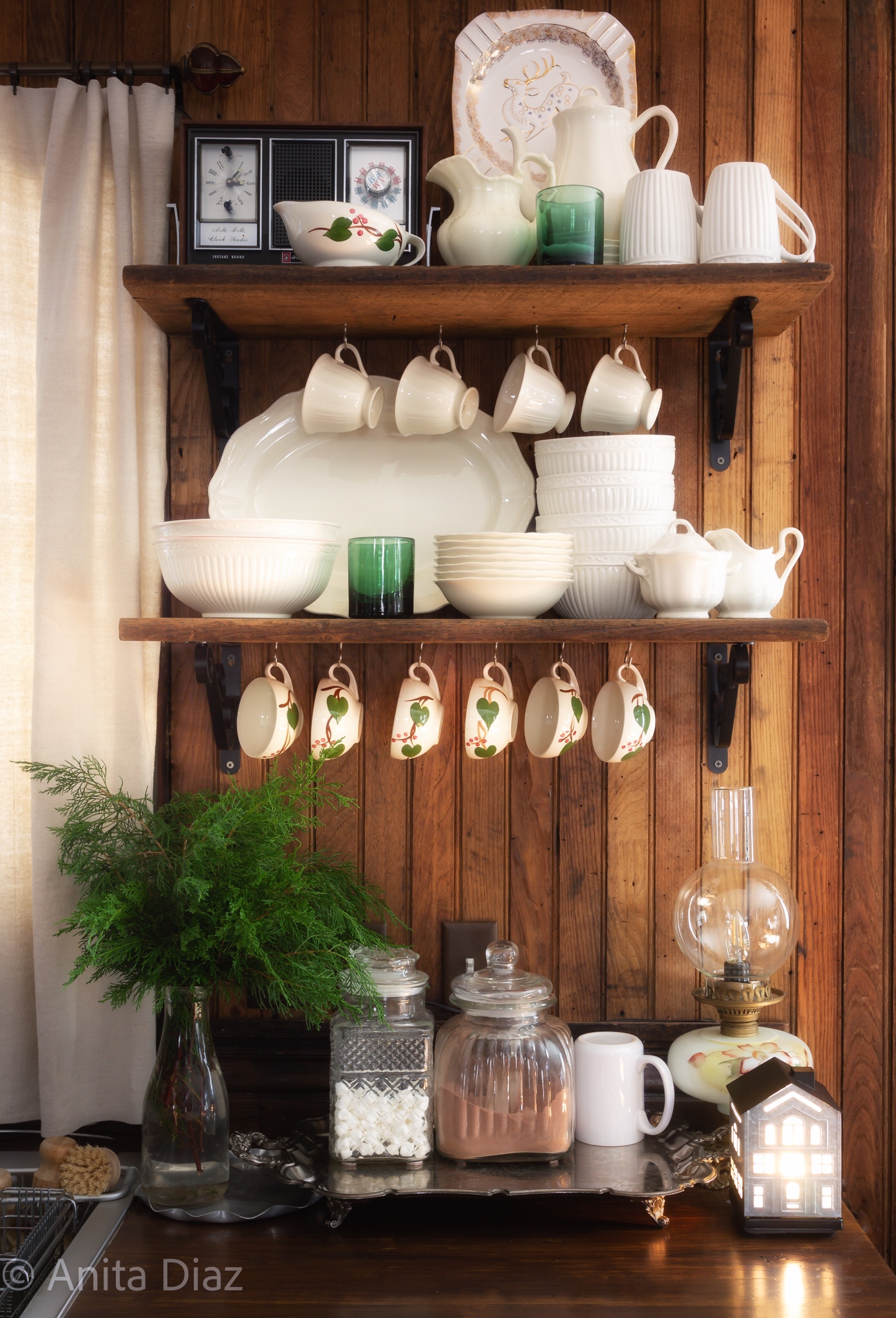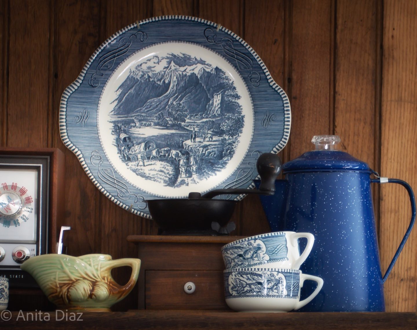 After a more neutral winter palette, I was ready to add some color, so I changed out some of the white dinnerware for blue. I love the Currier and Ives pattern by Royal China for winter, and added those coffee cups, a platter and the salt and pepper shakers. An enamel blue coffee pot paired with an antique coffee grinder are useable when needed and easy to reach, plus the coffee pot adds some solid blue to help ground the blue and white pattern. Not wanting anything too “matchy” I also used the McCoy pine cone creamer to include the green and brown shades. I feel this keeps it from looking boring, too deliberate or too much like store styling.