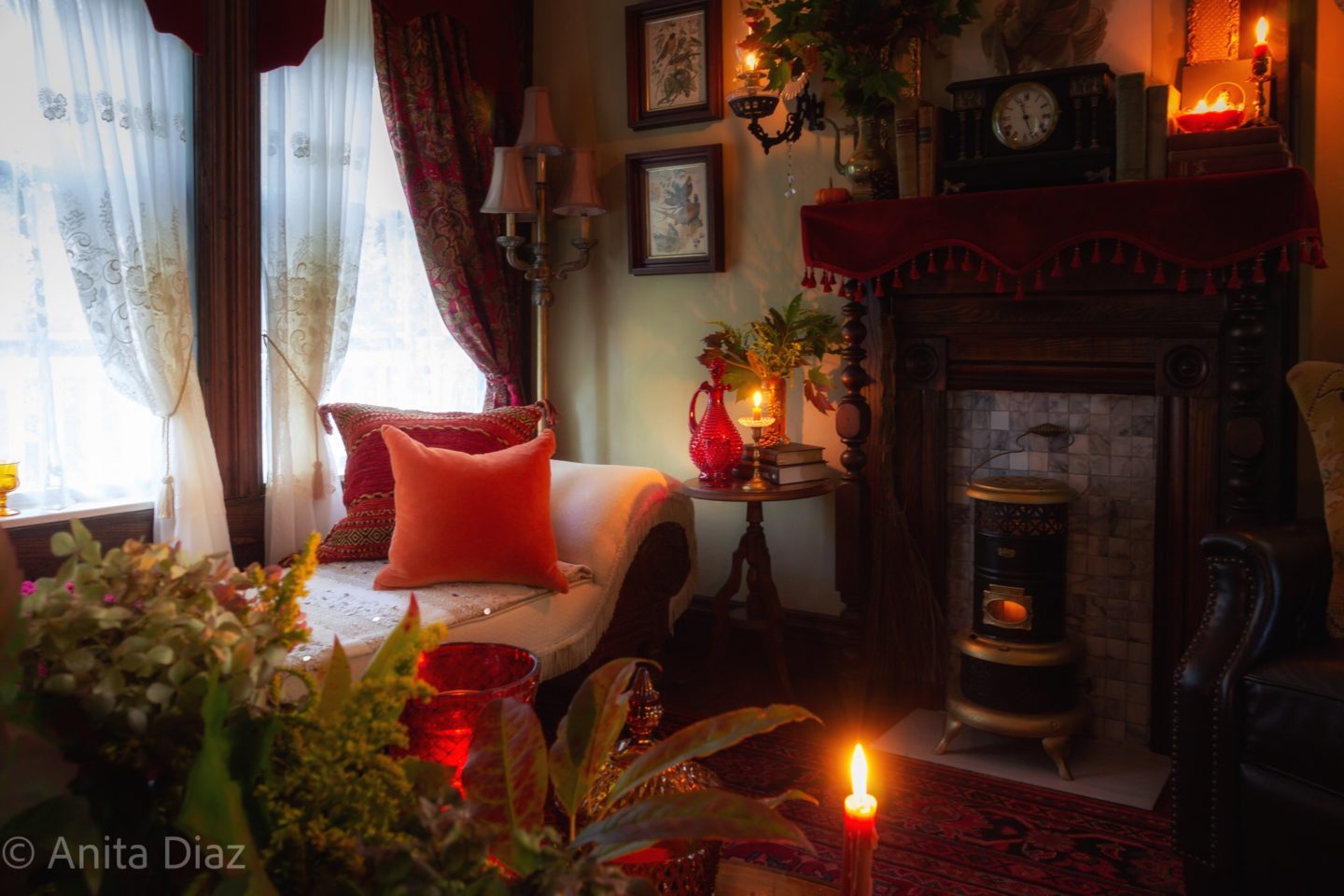 Absolutely stunning! You are truly gifted in this area … I have a question … is that a real fire in the antique stove? I think, if not, that it could be a great idea for me as I miss having a “fire” in the living room (although we have a German stove that heats the entire house so I still have wood burning – just not in the living room) and could put an antique mantle over it … brilliant!