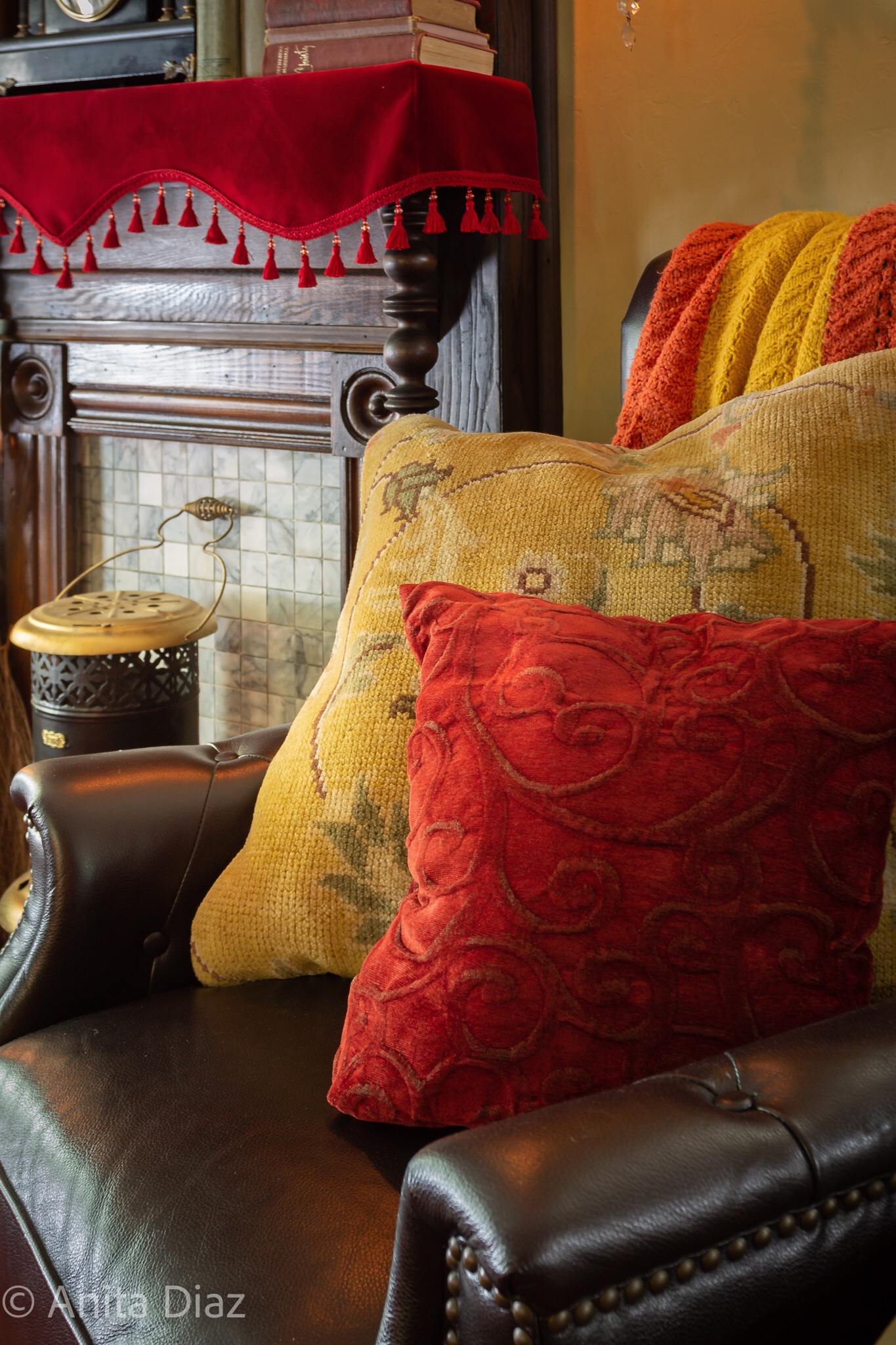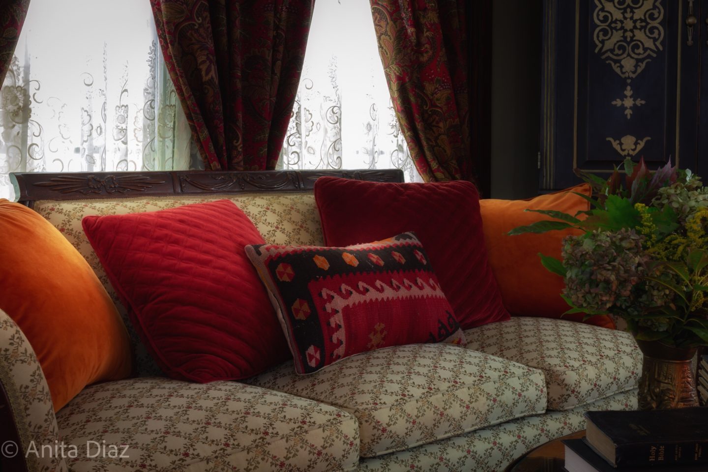 I changed out the pink and gold pillows from summer for the rust and red velvet pillows and a kilim print. I’ve used these several years now for this season. I also brought back the paisley curtains and velvet lambrequin.