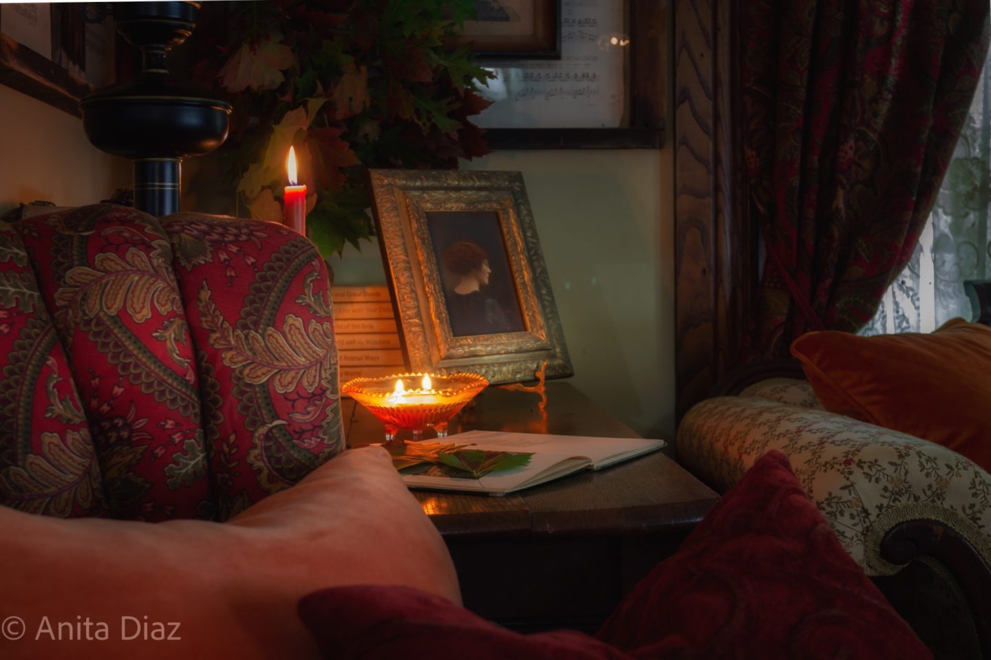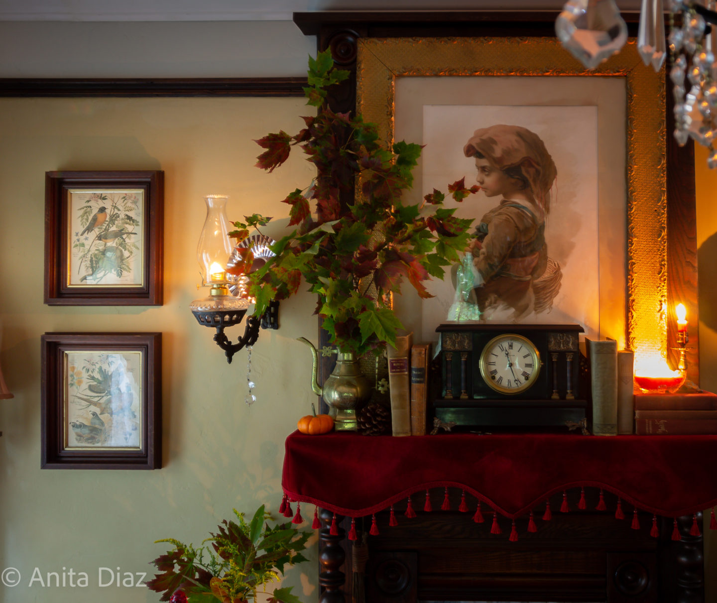 One thing I always look forward to is cozying up the house for fall and winter. There is nothing neutral about fall, and I’m here for all the happy color. The warm hues of autumn literally make me smile, and the color inspiration for inside my home is whatever nature offers outside. Our home is not old, but I have spent about ten years restoring and installing the Victorian trim that was carefully saved from great granddaddy’s house when it was, sadly, dismantled in the early 1960s, so I fell in love with Victorian style. Nothing makes me happier than seeing Victorian-inspired and collected cottagecore, dark academia, grandmillenial or “granny-chic” styles trending and so many younger people actually *restoring* older homes now instead renovating the history out of them:-) I love antiques and items that were built when quality mattered, so I love to look through my parents’ attic, and a shopping haul means antique, thrift or garage sale to me.