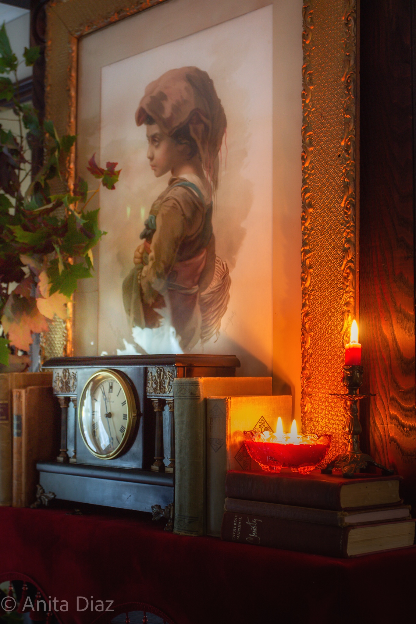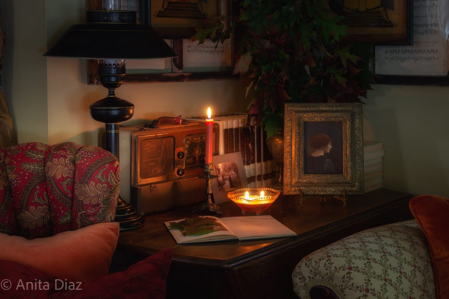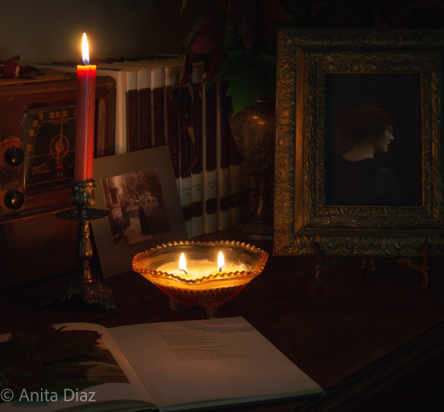 I love to be surrounded by things that have a story, and great granddaddy’s drop leaf table is filled with such things – books from my aunt, great grandmother’s 1935 portrait, her 1940s radio, a 1970s tole lamp and a favorite book of poetry given to me by my maternal grandmother.