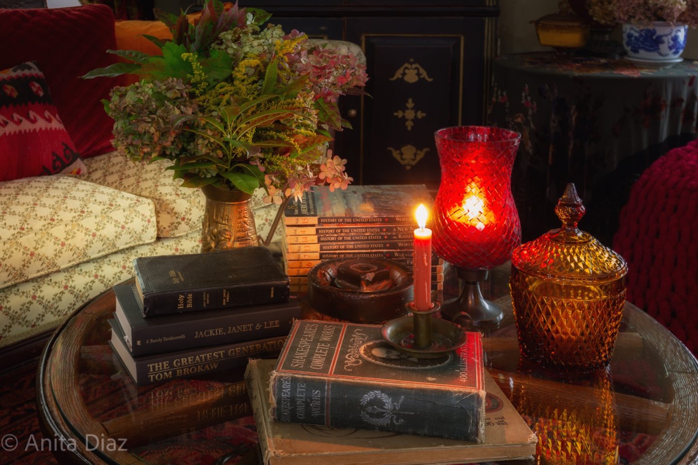 Hi Anita! I love the dried flowers on your coffee table. What a great idea of pouring candles into vintage glass pieces. Thank you for sharing! Happy Fall!