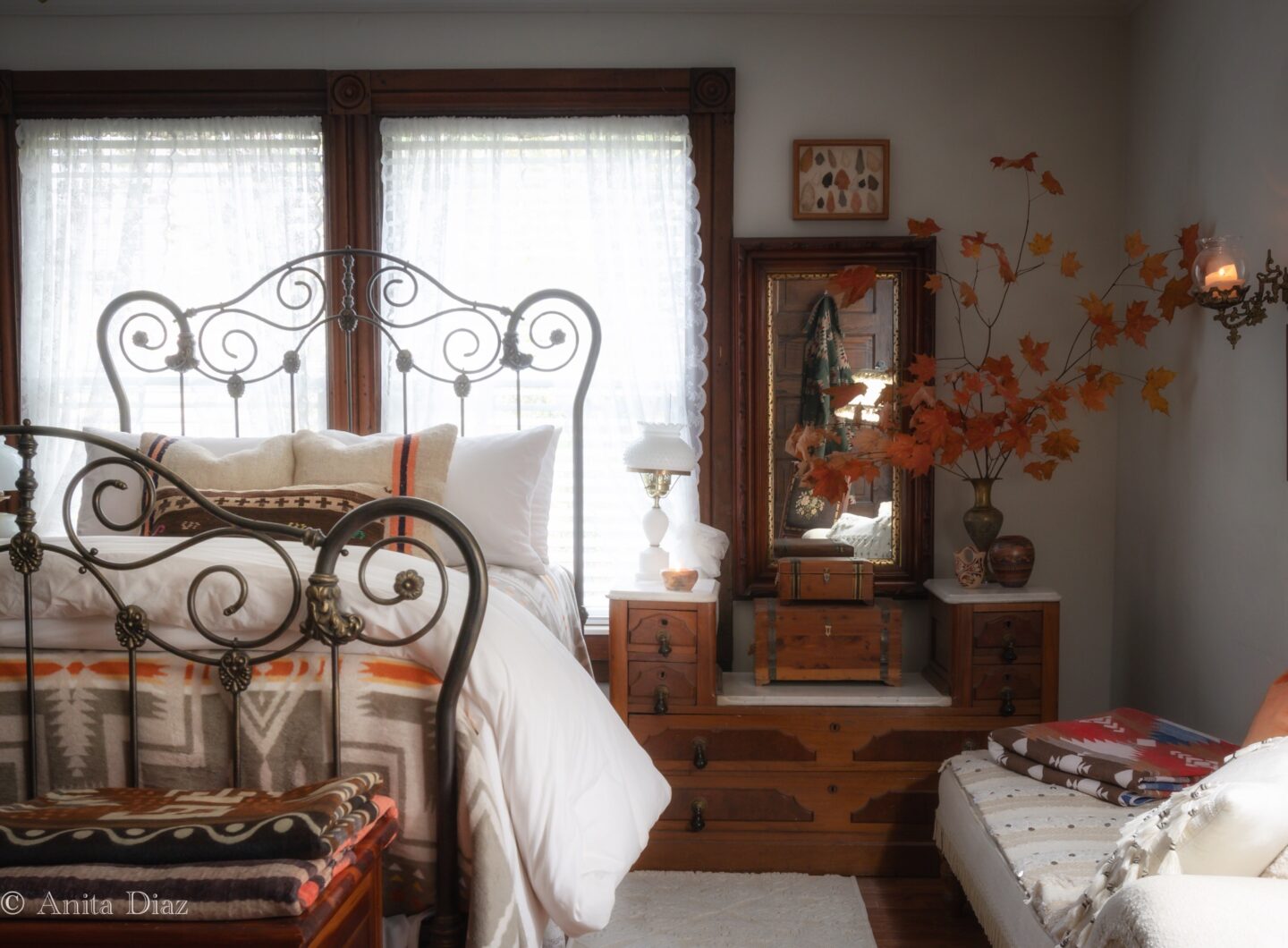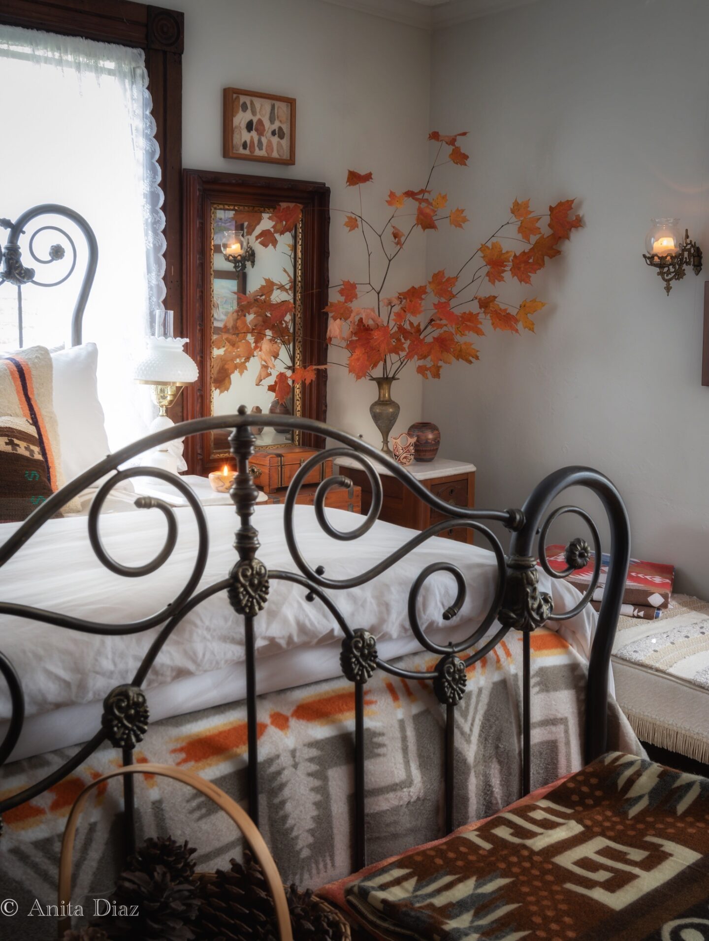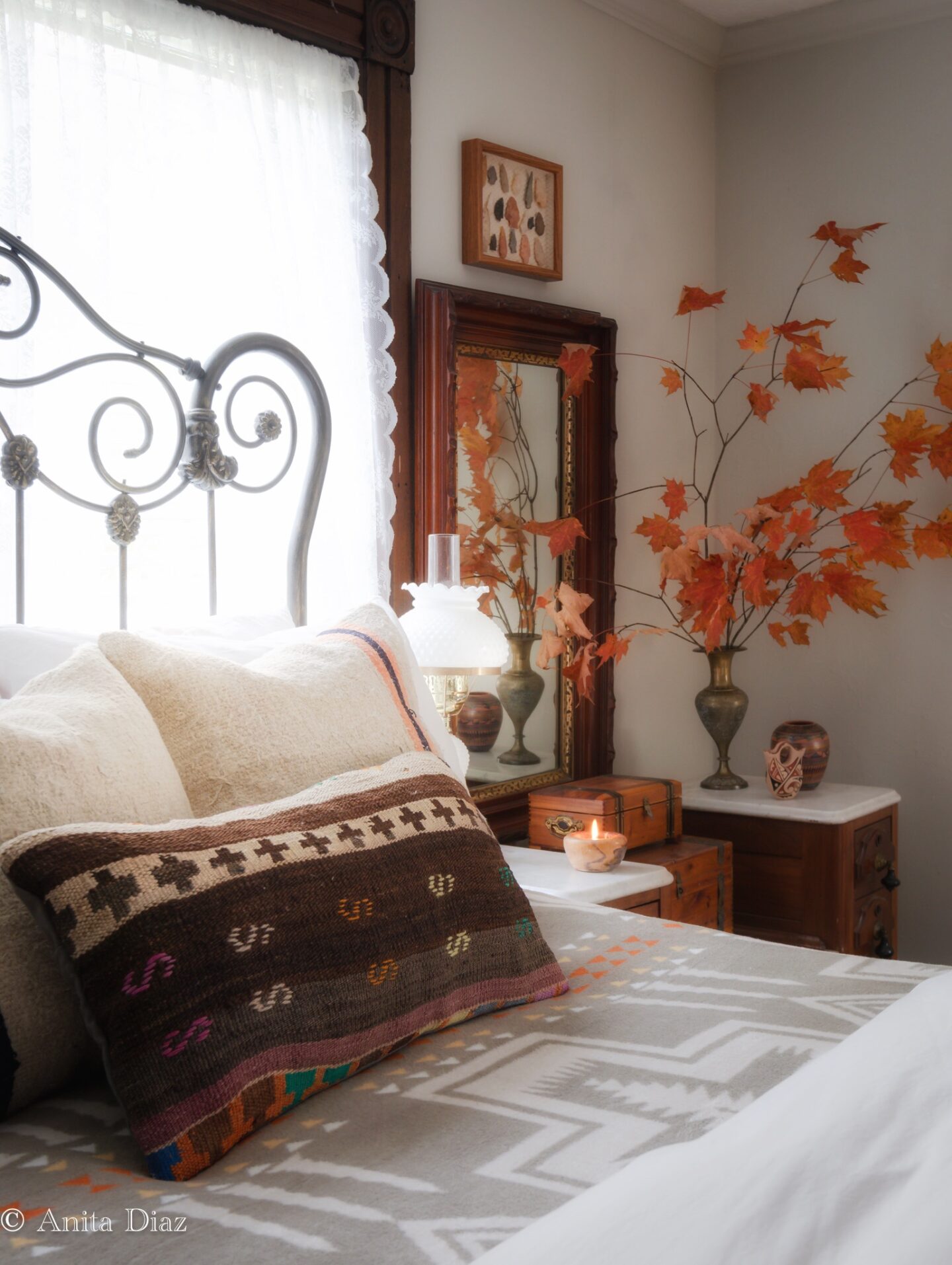 Hi everyone! I can’t say I really decorate for fall in the bedrooms – you’re not going to see a plastic leaf garland hanging over the headboard, but I always like to add seasonal touches mostly with textiles, warm down comforters for cold weather, and maybe a rug or two for the wood floors.