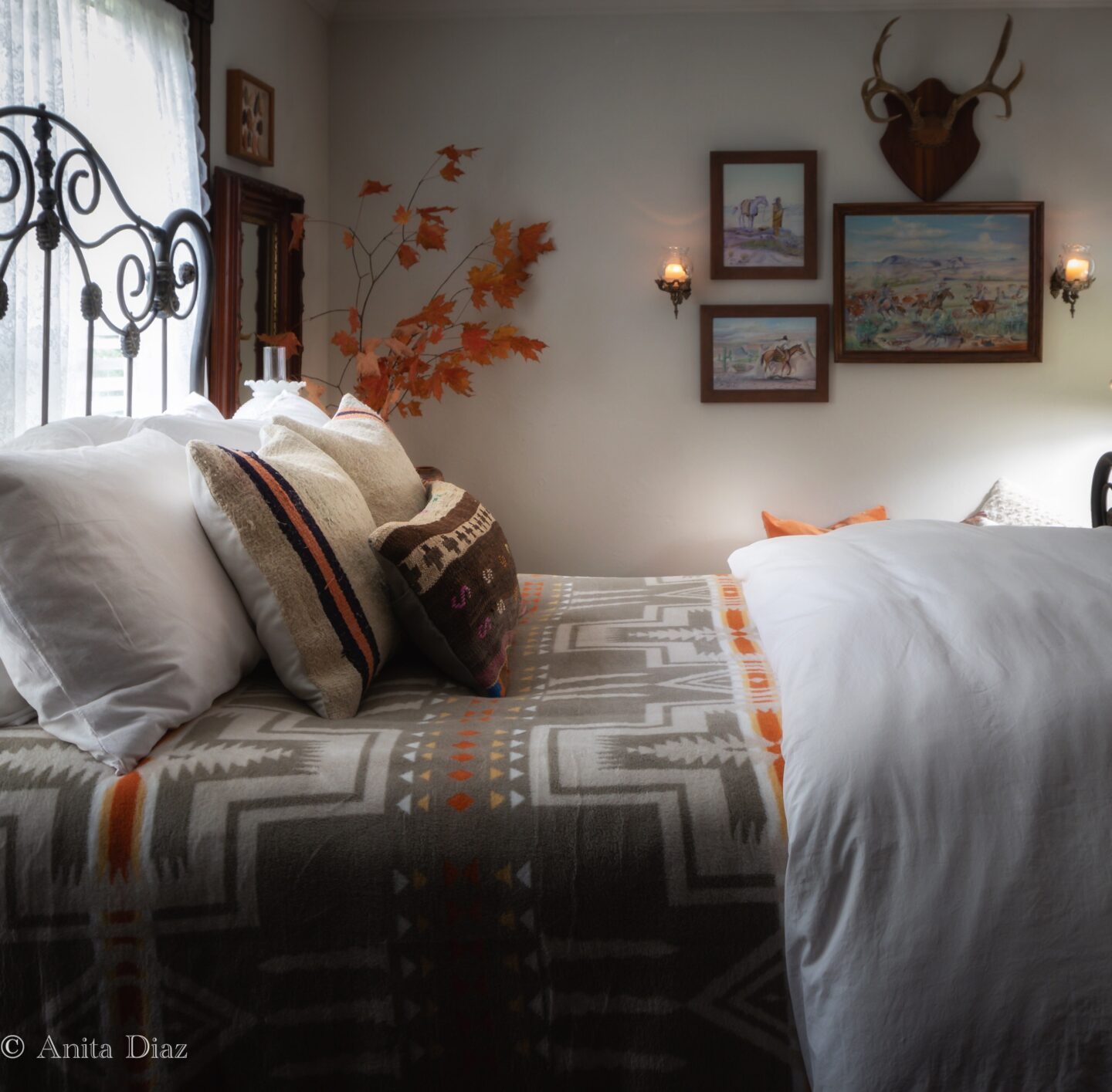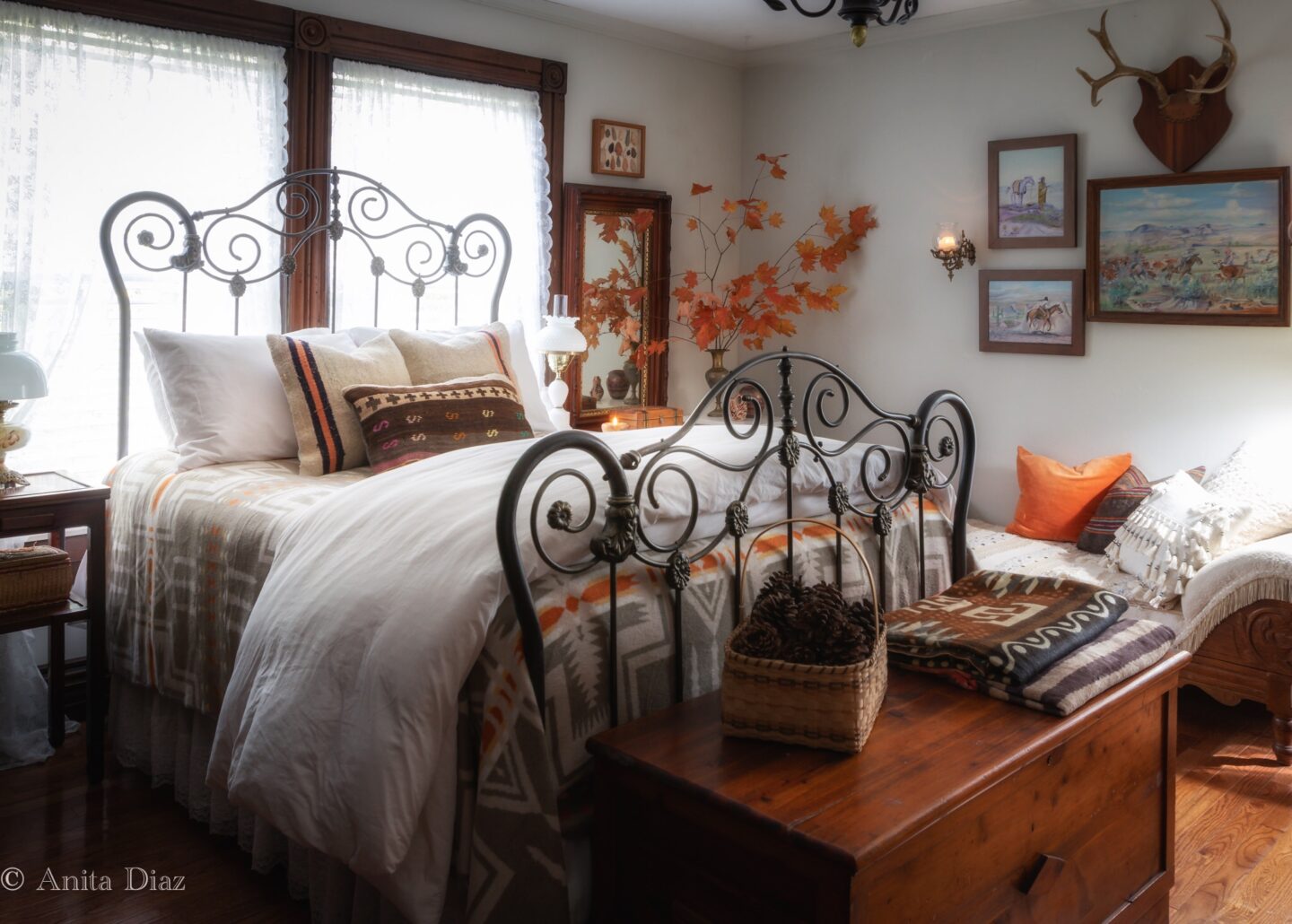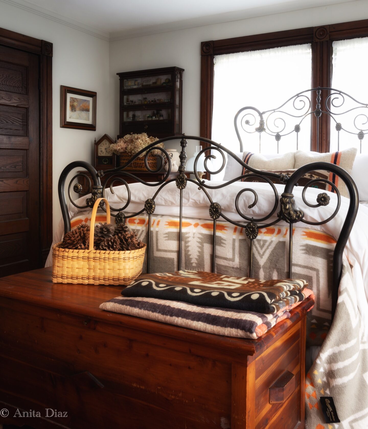 Hi everyone! I can’t say I really decorate for fall in the bedrooms – you’re not going to see a plastic leaf garland hanging over the headboard, but I always like to add seasonal touches mostly with textiles, warm down comforters for cold weather, and maybe a rug or two for the wood floors.