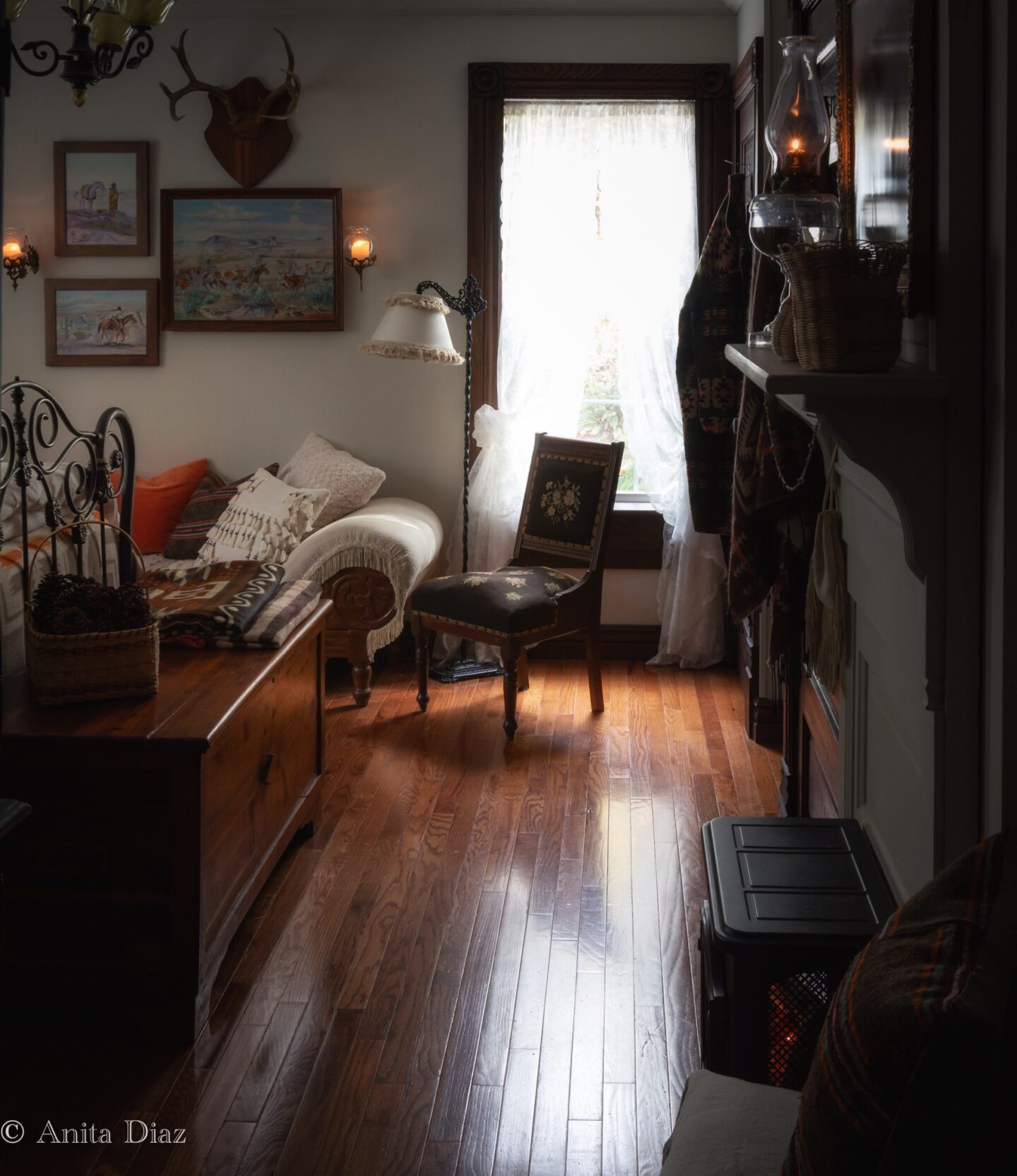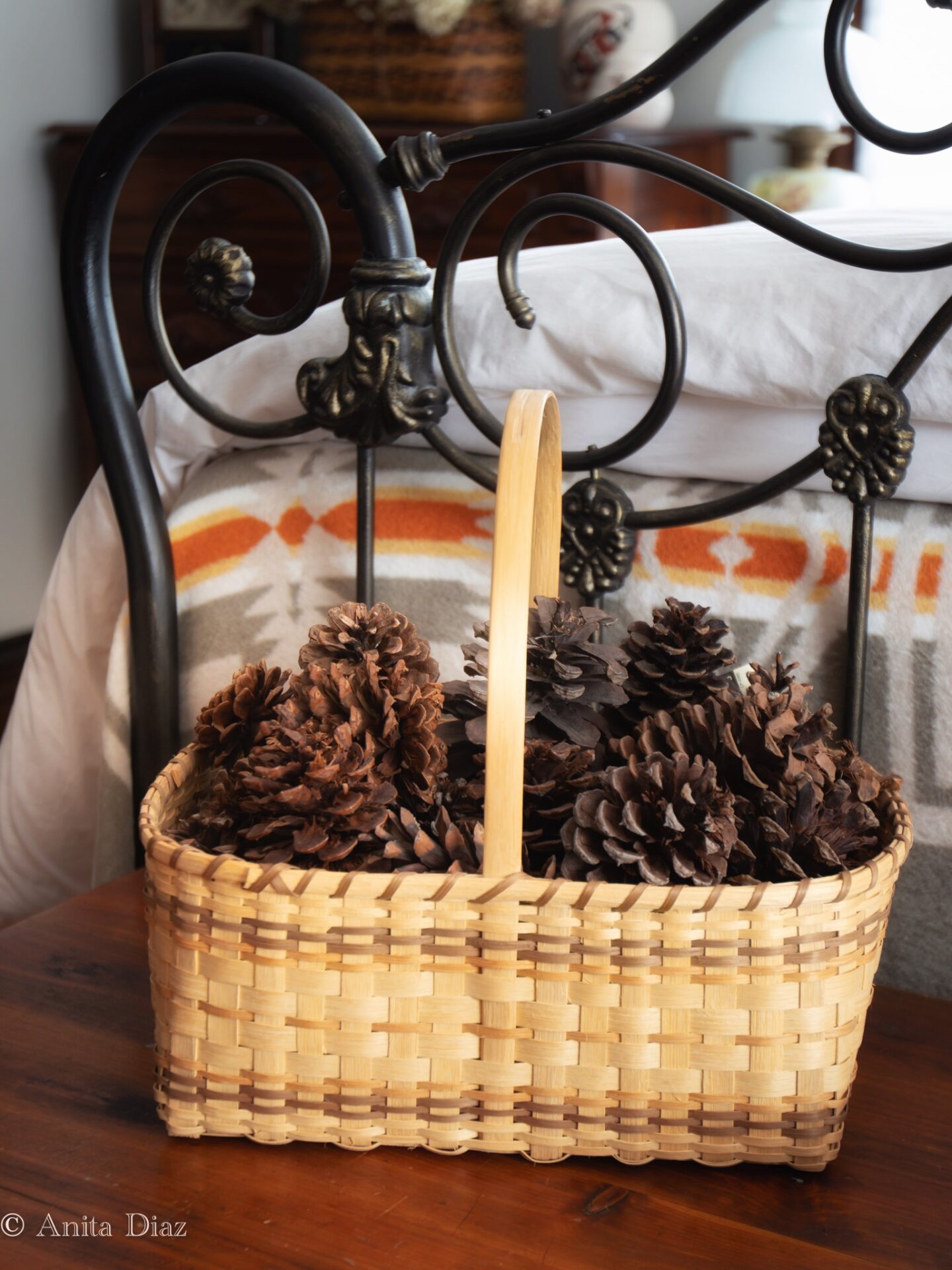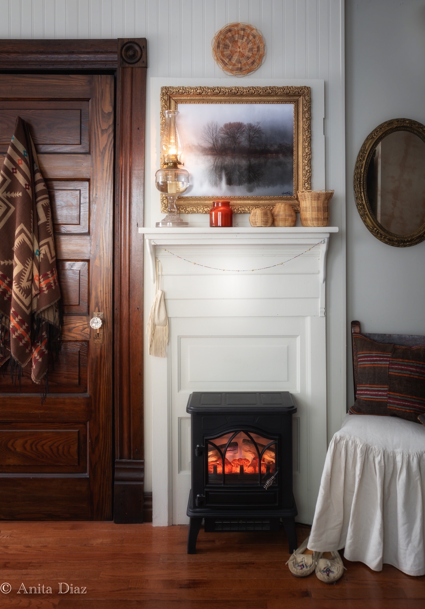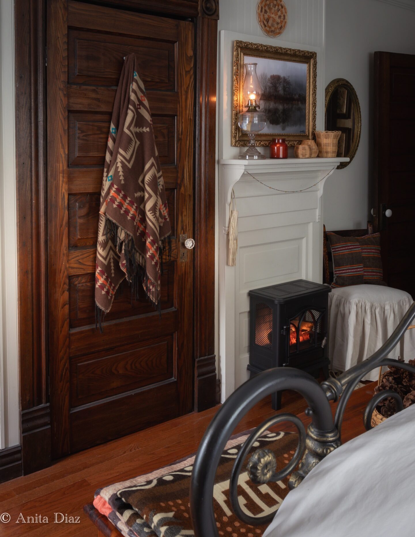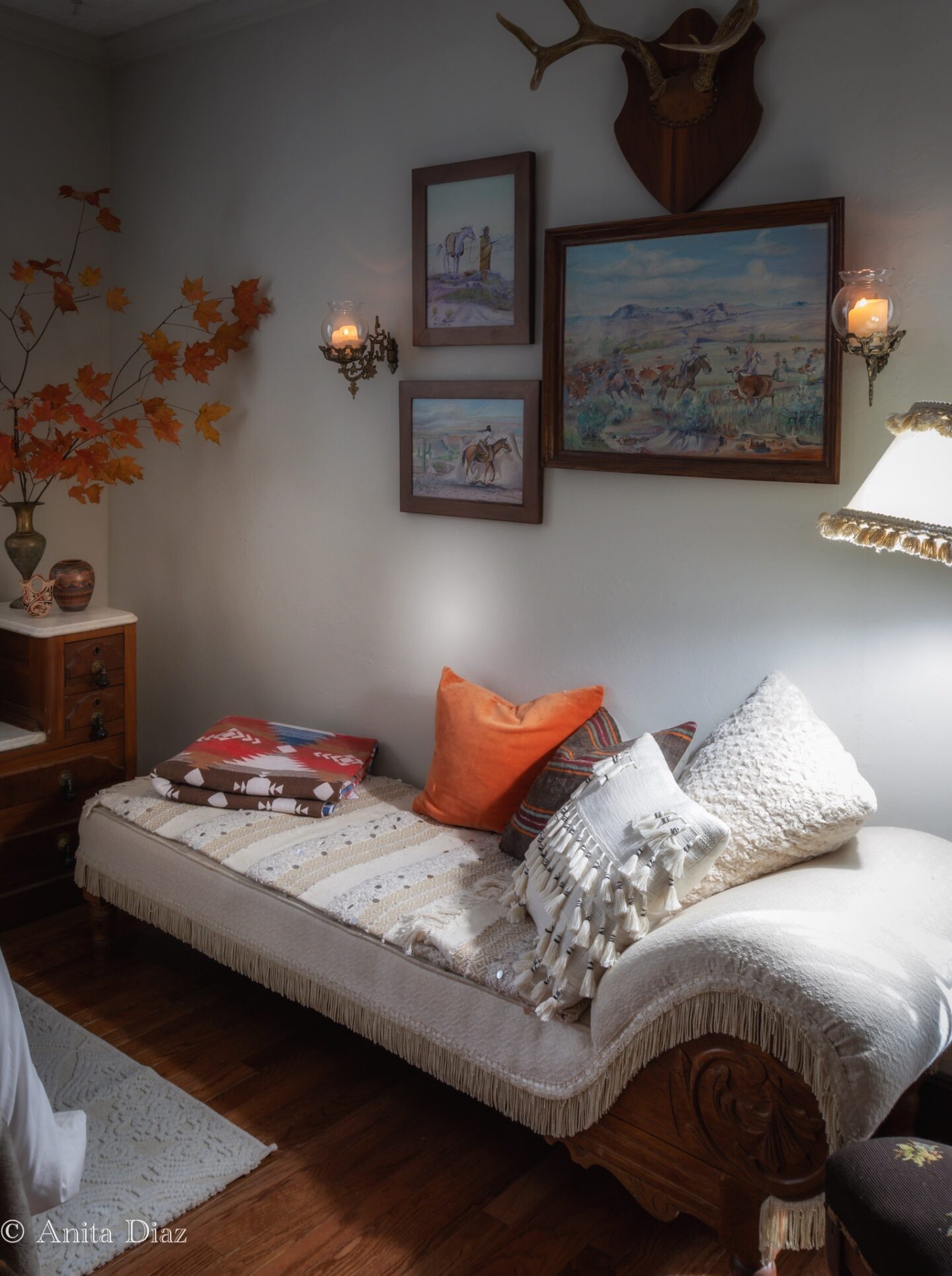 I added a shadow box I’d put together many years ago with some of the collection of arrow heads my Pappaw Chandler picked up over the years on his land. The larger vase is Navajo, and I don’t know the origin of the wedding vase but found that at a thrift store years ago. I added some beautiful maple leaves in an inherited brass vase. The Beacon blanket is vintage from the 1970s I think.