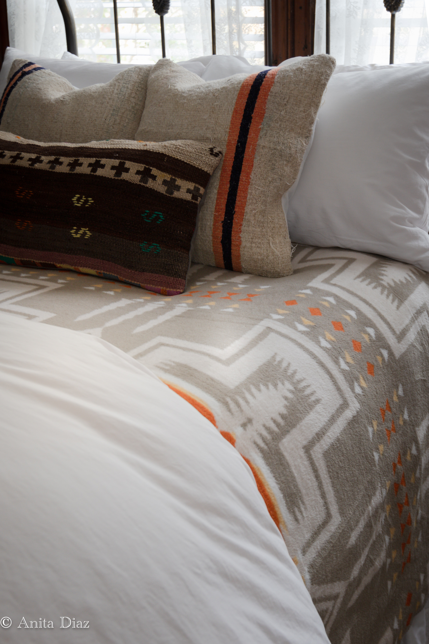 I pretty much always use all white linens then add to that with pillows, blankets, quilts, etc., for each season. This summer, I ran across a beautiful Beacon Blanket, and  funny enough, the business selling them was nearby in Sylva – Southern Textiles. (They also sell on amazon, etsy and eBay) I have a couple of vintage Beacon blankets and never knew they were made for many years here in Swannanoa. They’re now made in Flat Rock, also nearby. Back before textile mills, and other manufacturing sadly moved to China, North Carolina was a big producer of textiles.