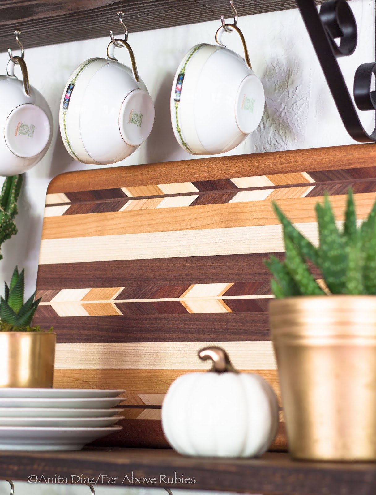 I love the open shelves we added and enjoy accessorizing them for all seasons. I have added some Native art, including a Navajo pot and an amazing Cherokee-crafted cutting board, to the inherited china.