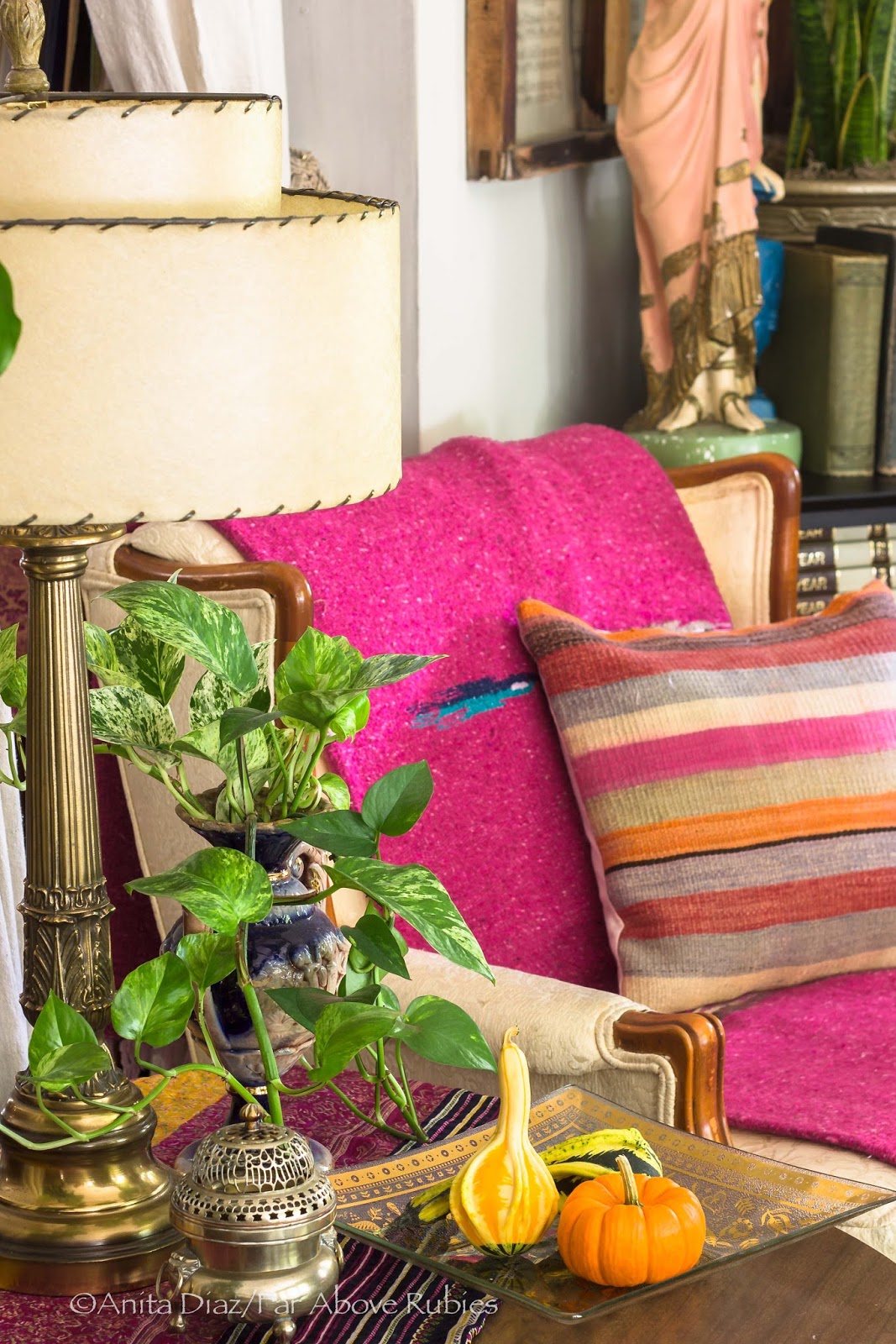 Anita – I'm in love! You are so creative and I love how you incorporate your heritage and family heirlooms into your home. I love your unabashed love of color – you do it right! I love those fiberglass mid-century lamp shades too – I have one with a chalk ware mariachi dancer. Growing up, my parents had those brass plaques in our kitchen too. Every part of your house is perfection – I'm thrilled to have you on the tour this year! Happy fall!