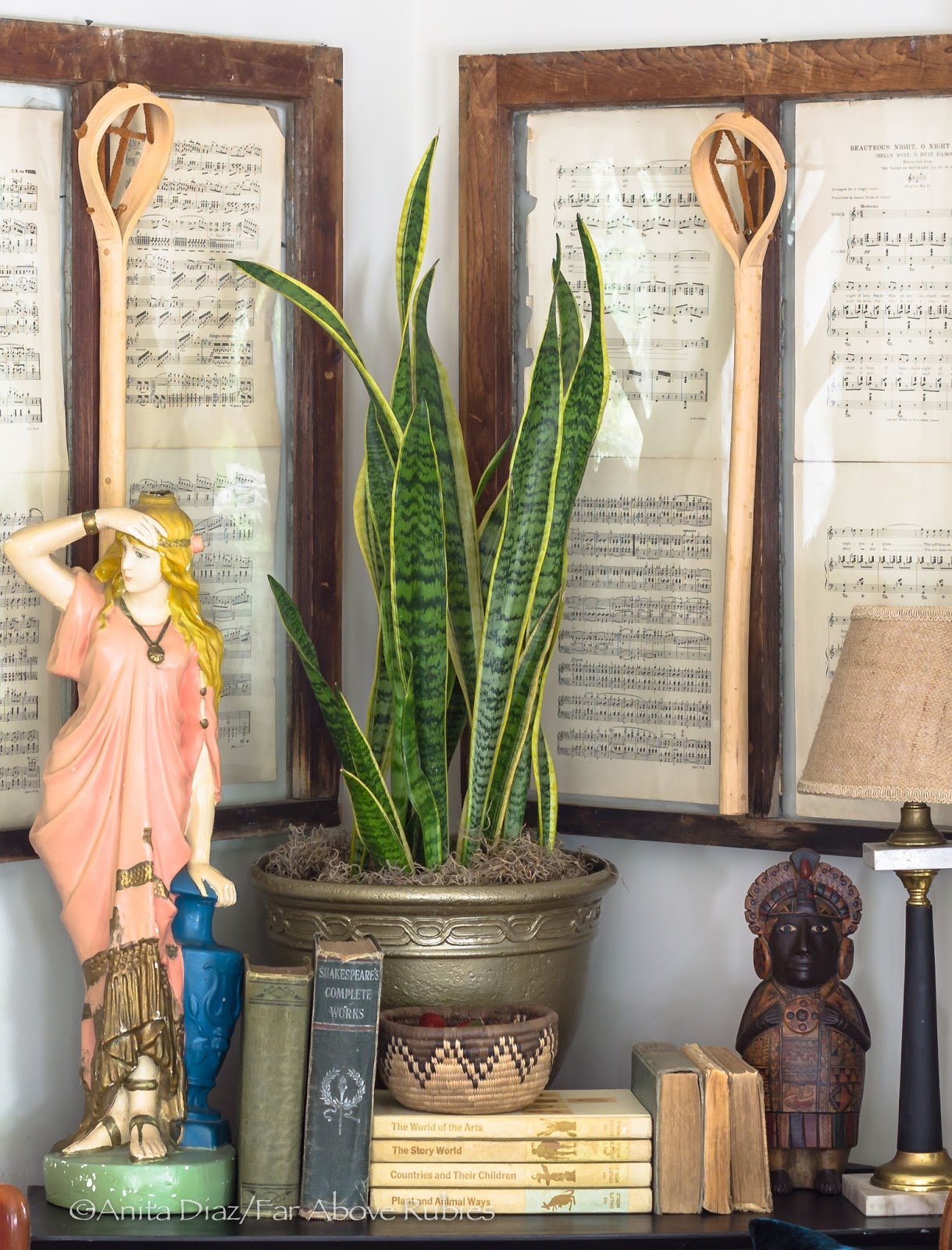 Windows from the old house are lined with sheet music and display myCherokee stick ball sticks, which reflect my mother’s Cherokee heritage. A statue I bought in Bolivia is balanced by a mid-century lamp base my grandmother painted, and my grandfather’s books, which are still used. I found the Nisqually basket on a trip to Washington.